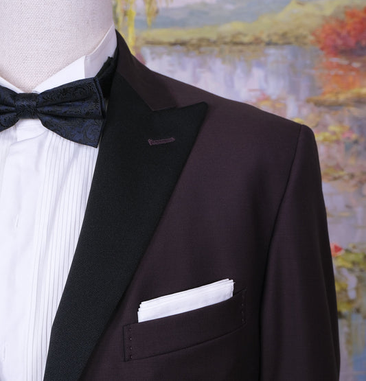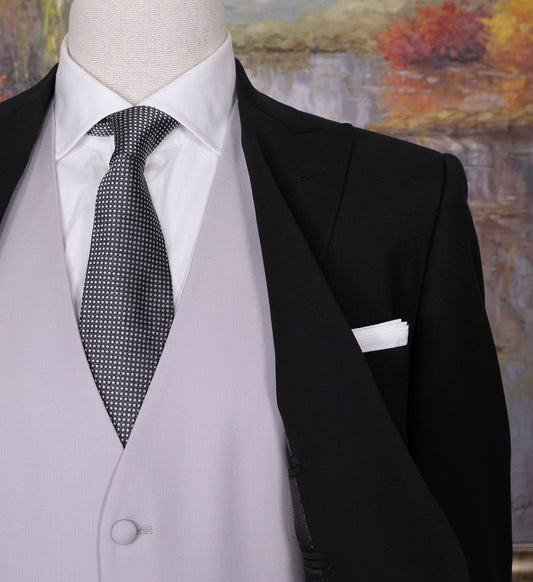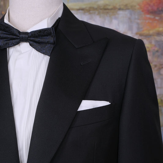 The jacket and trousers of the evening dress are made of the same fabric, and the white waistcoat contrasts with the dark ensemble. Black has been the most popular colour for tailcoats since the 1850s, with extremely dark blue a rarely seen option. The outfit is completed with accessories: a white marcell bowtie, silk socks, a pocket handkerchief and black formal shoes, and a marcella shirt, often finished with separate shirt buttons and cufflinks. The jacket is cut open and cannot be buttoned up. The jacket front ends just above the waist and has a long tail cut to the knee. As a special feature, two buttons remain on the back of the tailcoat, a remnant of an era when the long tail was buttoned up while mounted.
