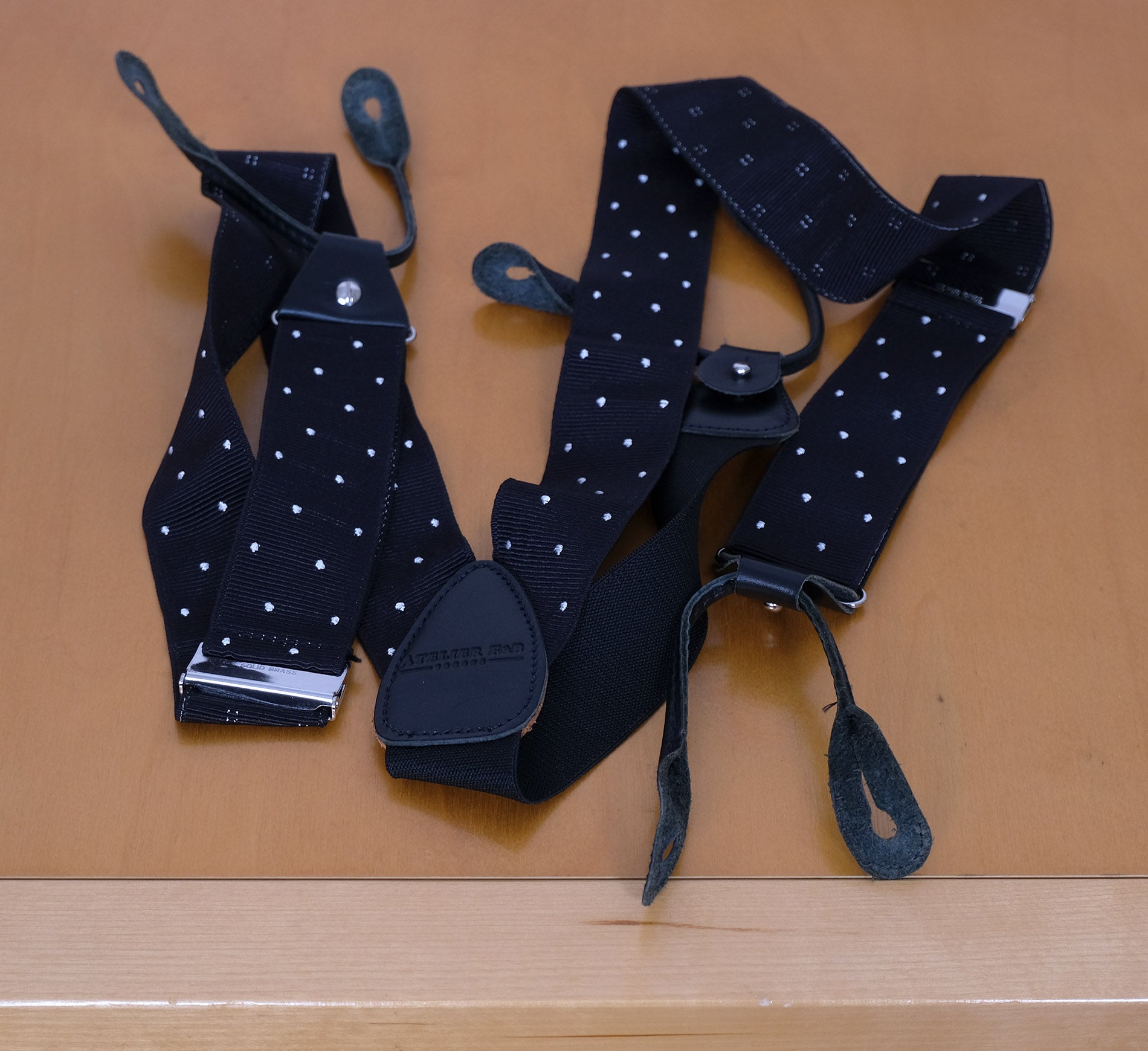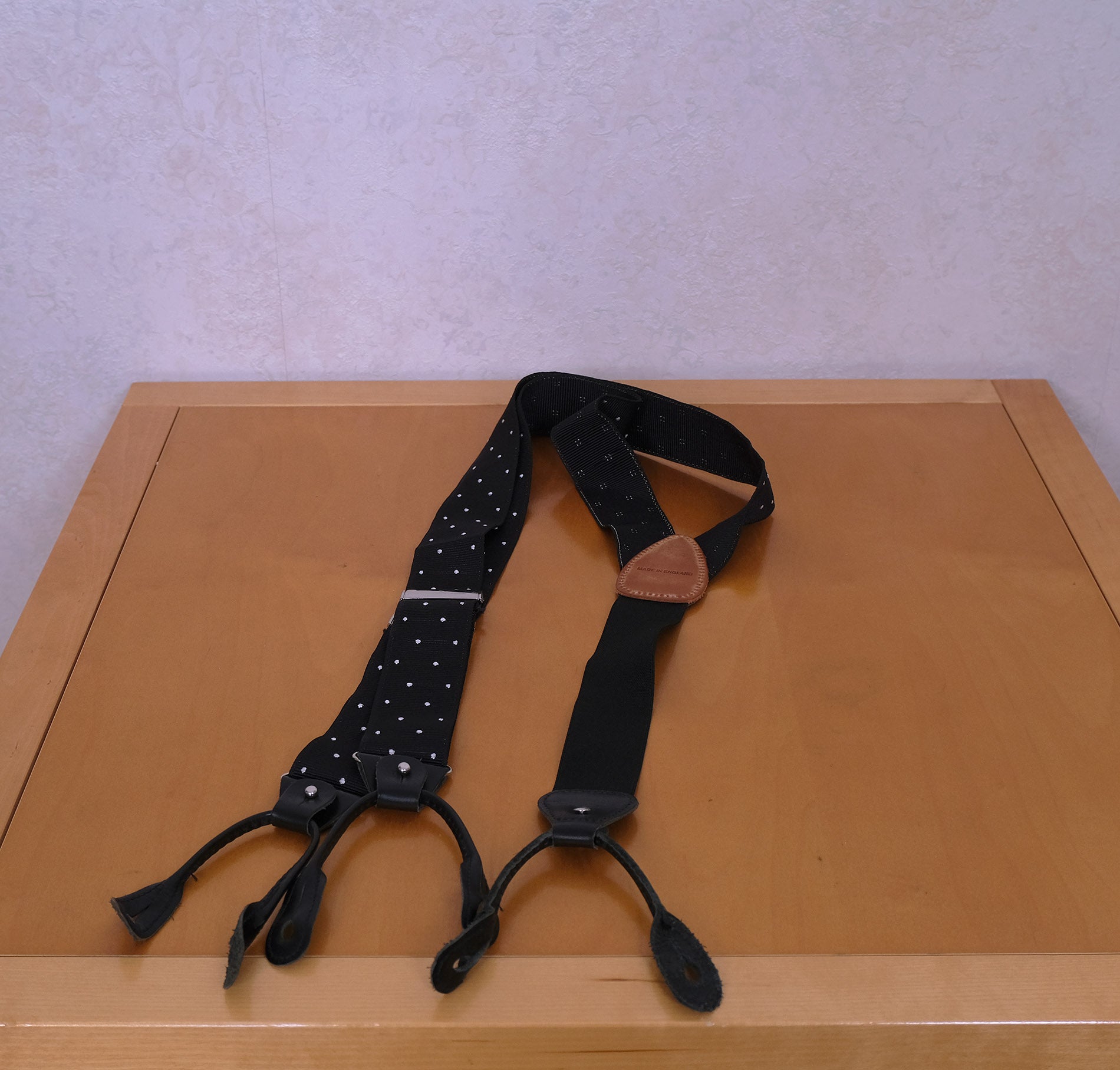 Nämä olkaimet eli housunkannattimet eli henkselit on ostettu Herrainpukimosta. Niiden kärjessä on lenkit, joten mallia voi käyttää vain sellaisten housujen kanssa, joiden vyötärön sisällä on napit.