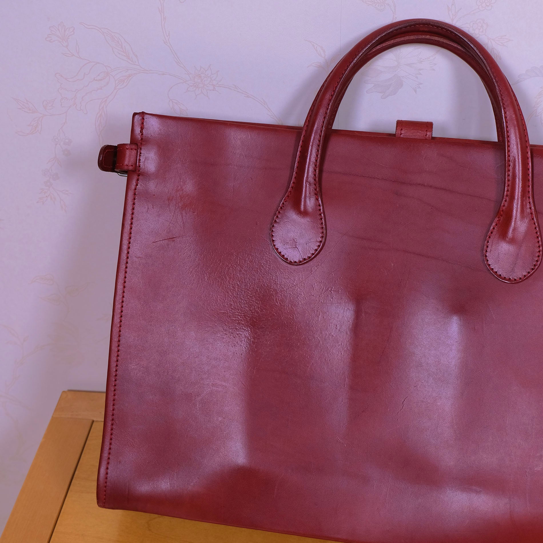 Salkku on mainiossa kunnossa: ei repeämiä tai hajua tai venymiä. Yhdellä puolella on joukko painaumia, kun salkku on hinkannut työmatkalla reunaa vasten. Toisella puolella on muutama haalea naarmu, jotka katoavat oikean värisen nahkavoiteen avulla.