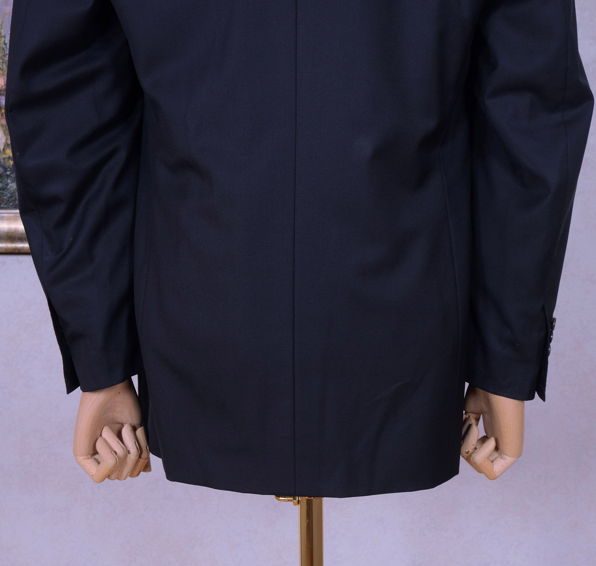 Puku on hyvässä kunnossa: ei reikiä, hankaumia tai hajua. Kankaassa on kuitenkin tahra selässä ja hihojen alla, joten kuivapesun hinta on vähennetty valmiiksi. Yksi hihanappi on murtunut ja helposti korvattavissa.