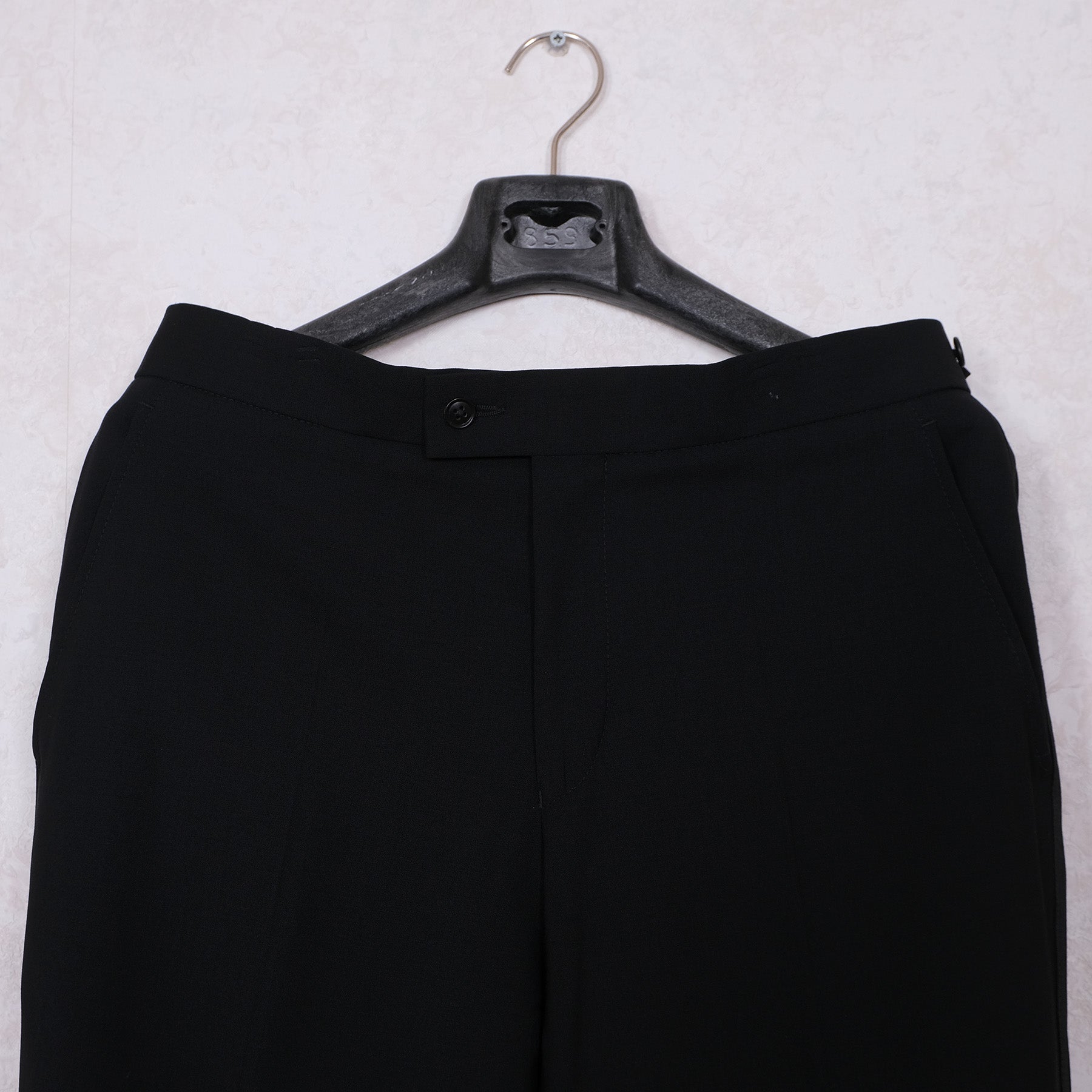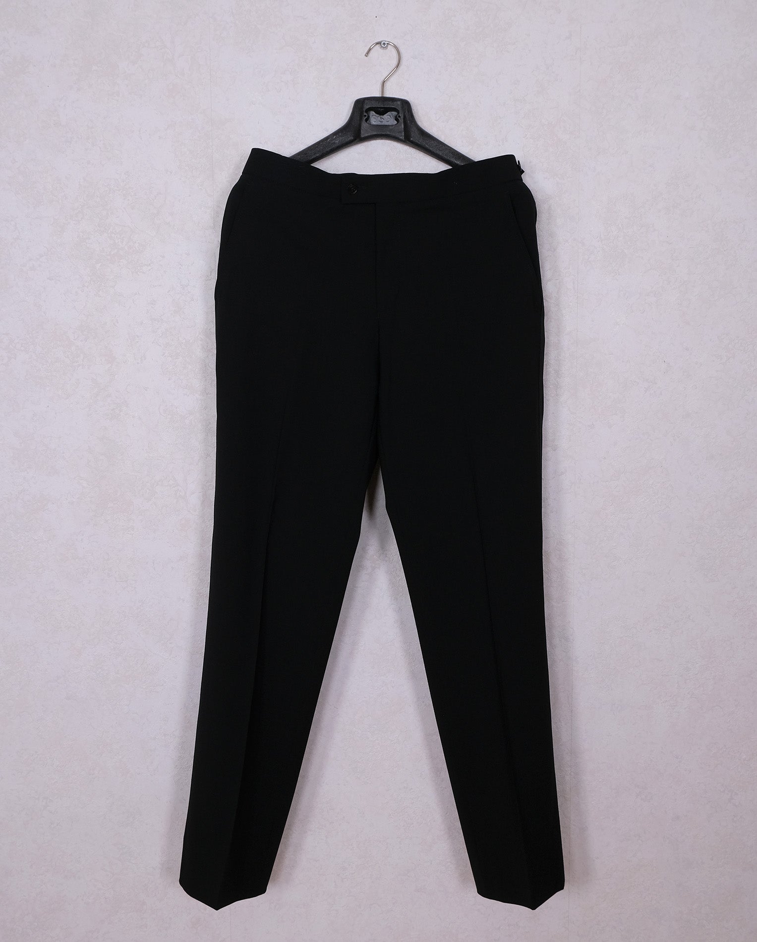 The jacket is marked 46EU and the trousers are 148, meaning a longer 48EU. However, the jacket has wider shoulders than usual, so it can also fit a size 48EU. If necessary, any seamstress can widen the jacket at the back.
