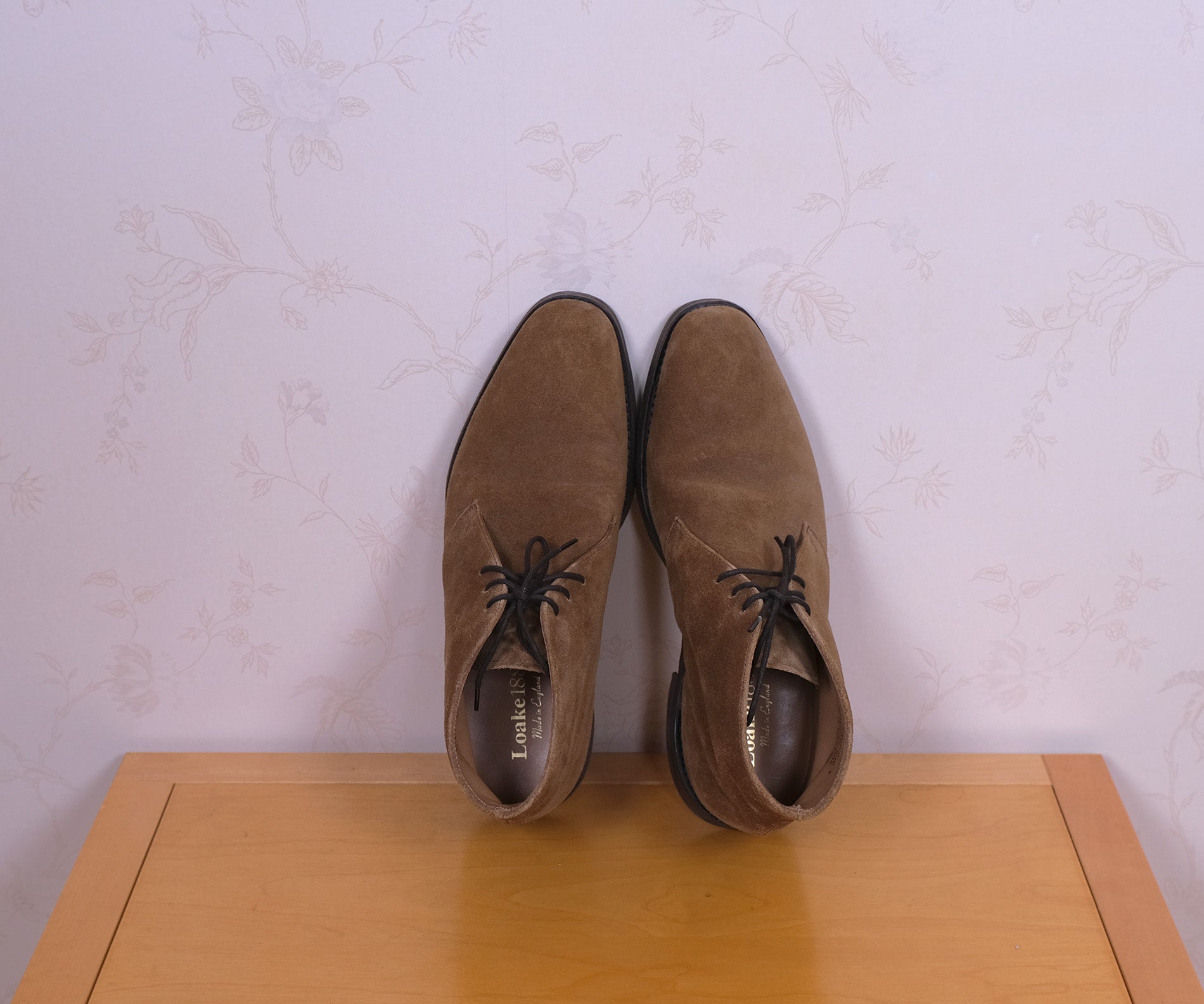Päällinen ruskeaa mokkanahkaa, terävämpi kärki, nahkavuori, ulkopohja vahva Dainite, reunos nahkaa. Parissa on Goodyear welt- eli reunosrakenne.