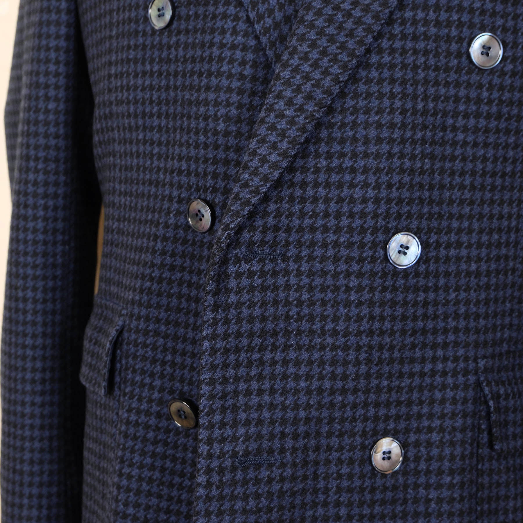 The fabric is 100 % soft and dense wool with a  houndstooth pattern. It is flannel which is the warmest material in winter. The fabric is woven by Vitale Barberis Canonico in Italy, the oldest weaving mill in the country. Super 150-quality.