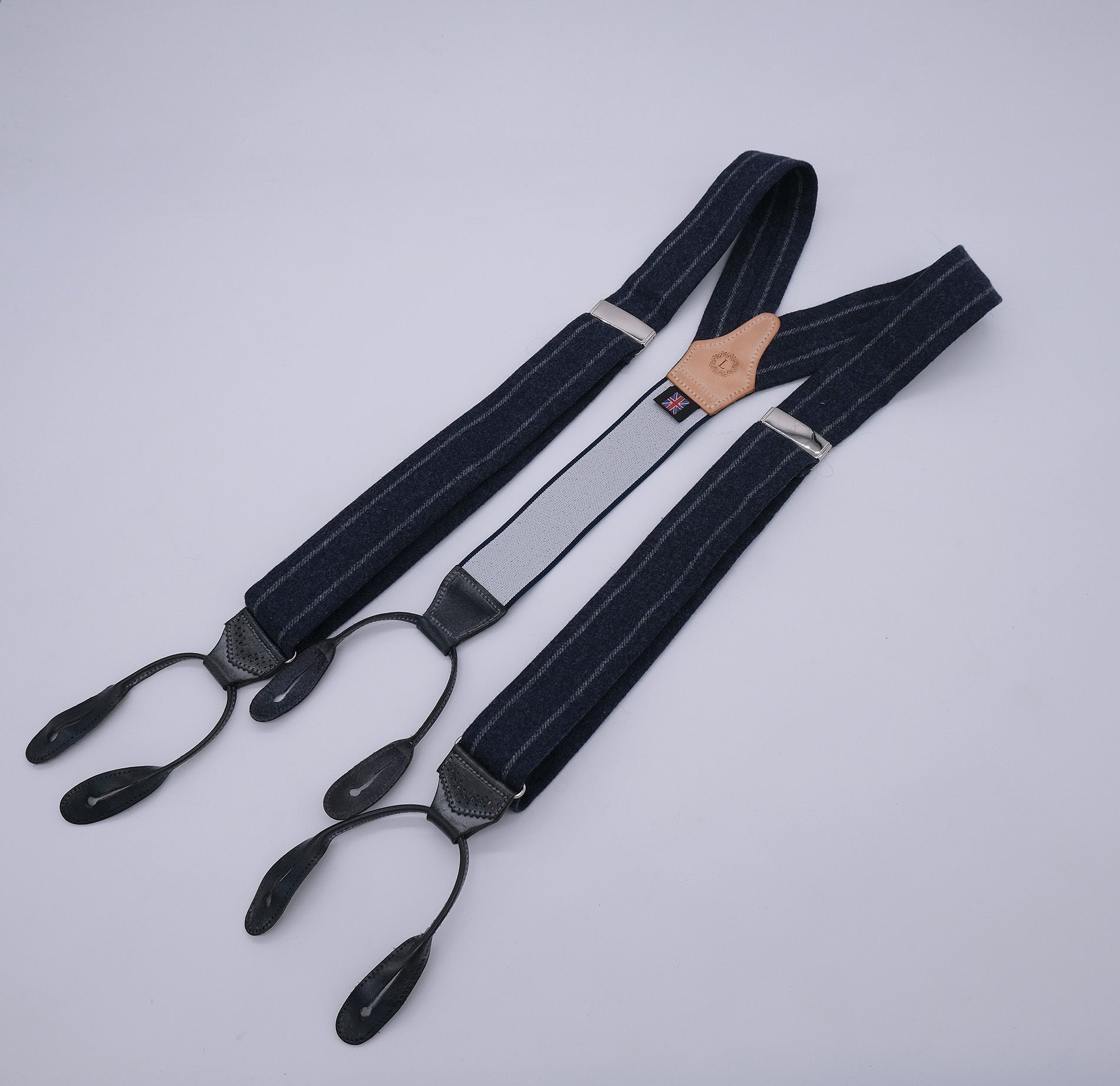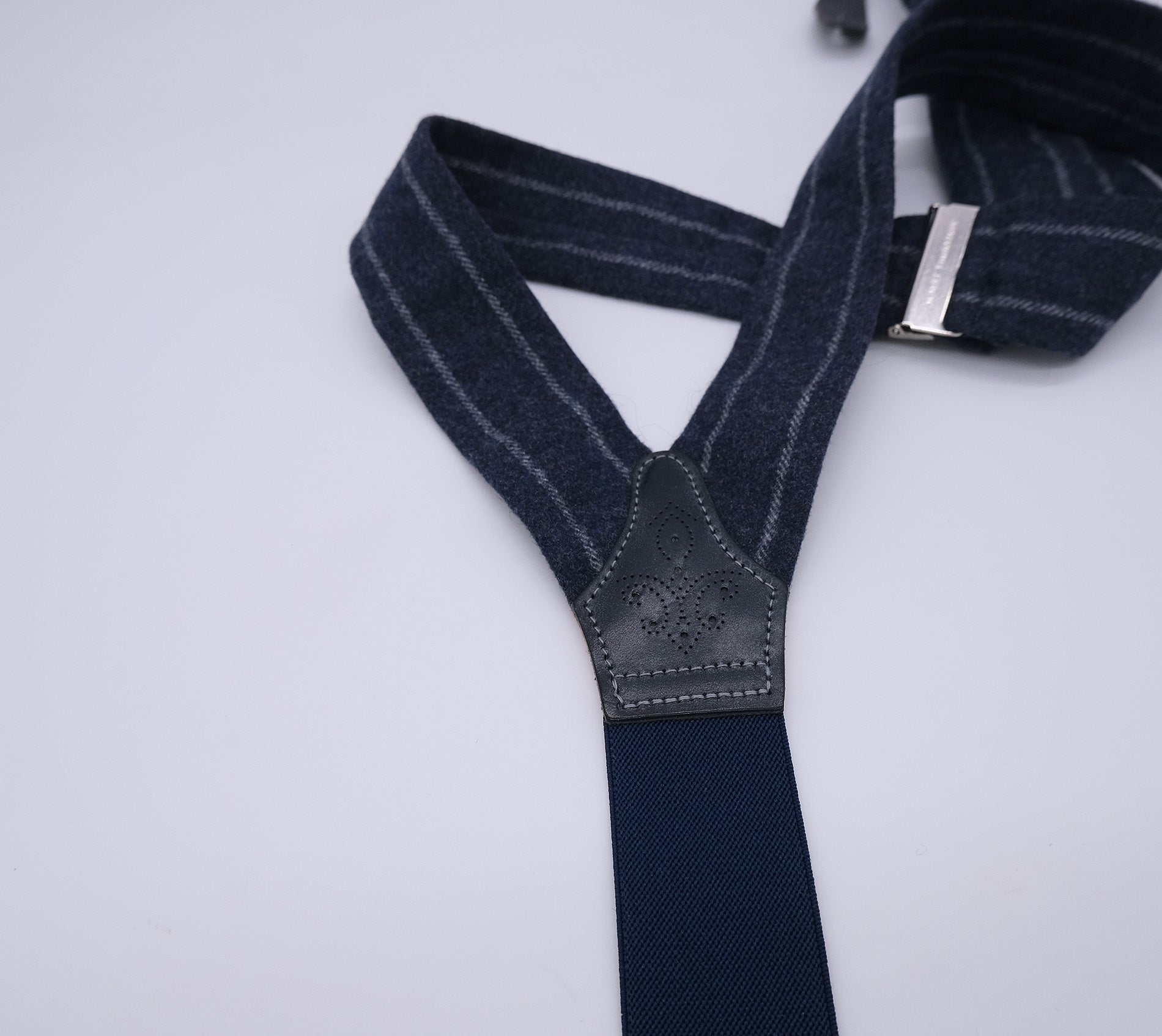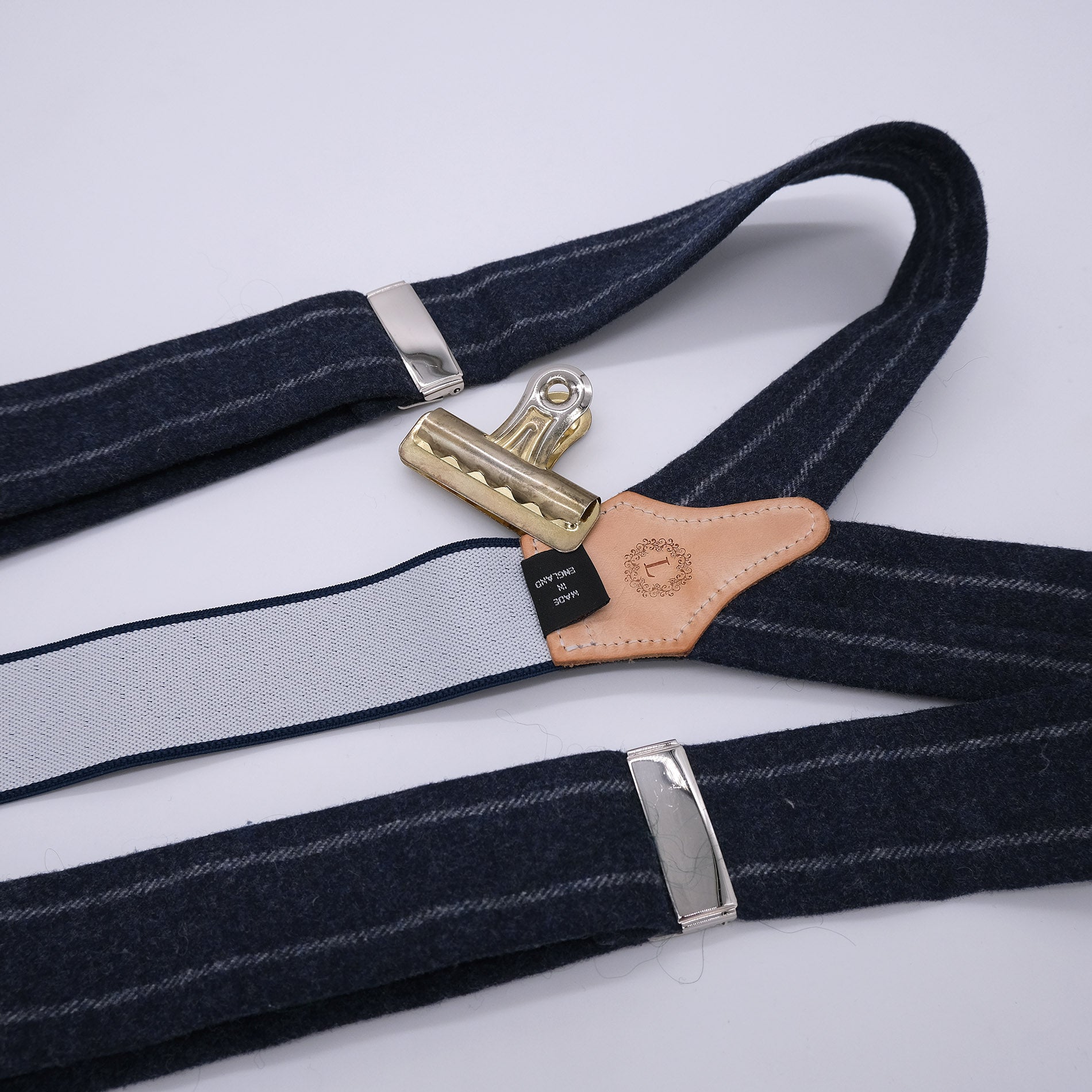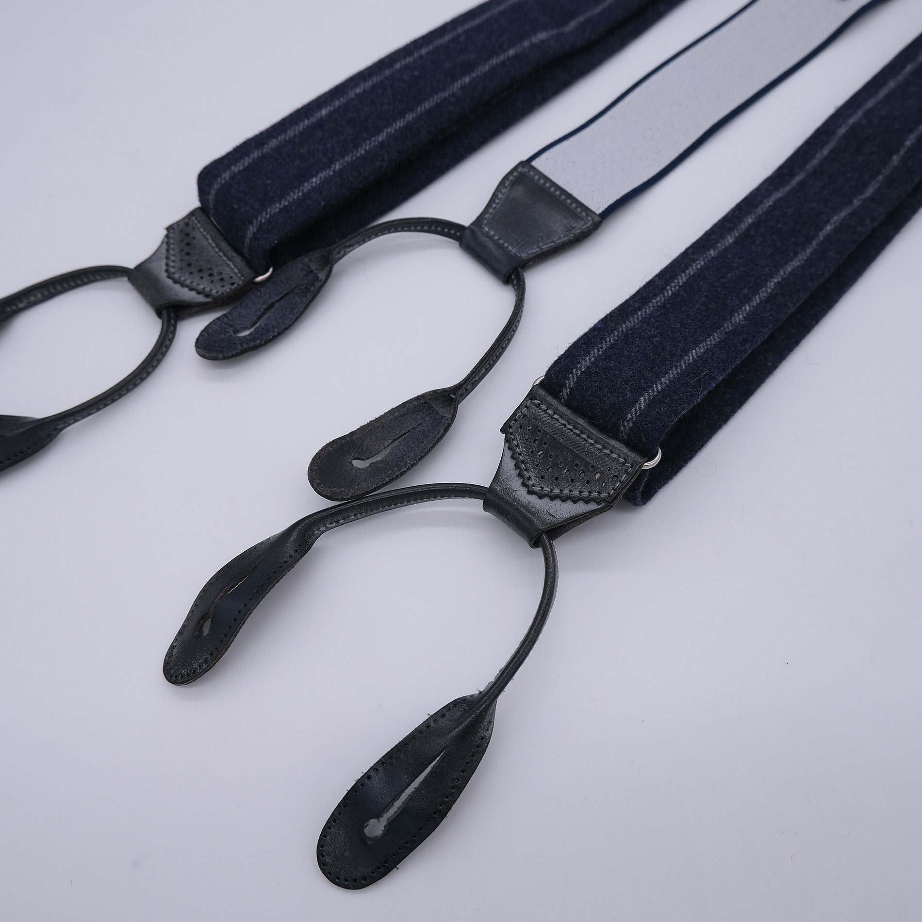 Sini-harmaa väri, joustonauha päässä, sileää patinoitua nahkaa, metalliosat messinkiä, brogue-kuviointi, villakangas Hardy Minnisin kutomon valmistamaa flanellivillaa. Pituus säädettävissä helposti.
