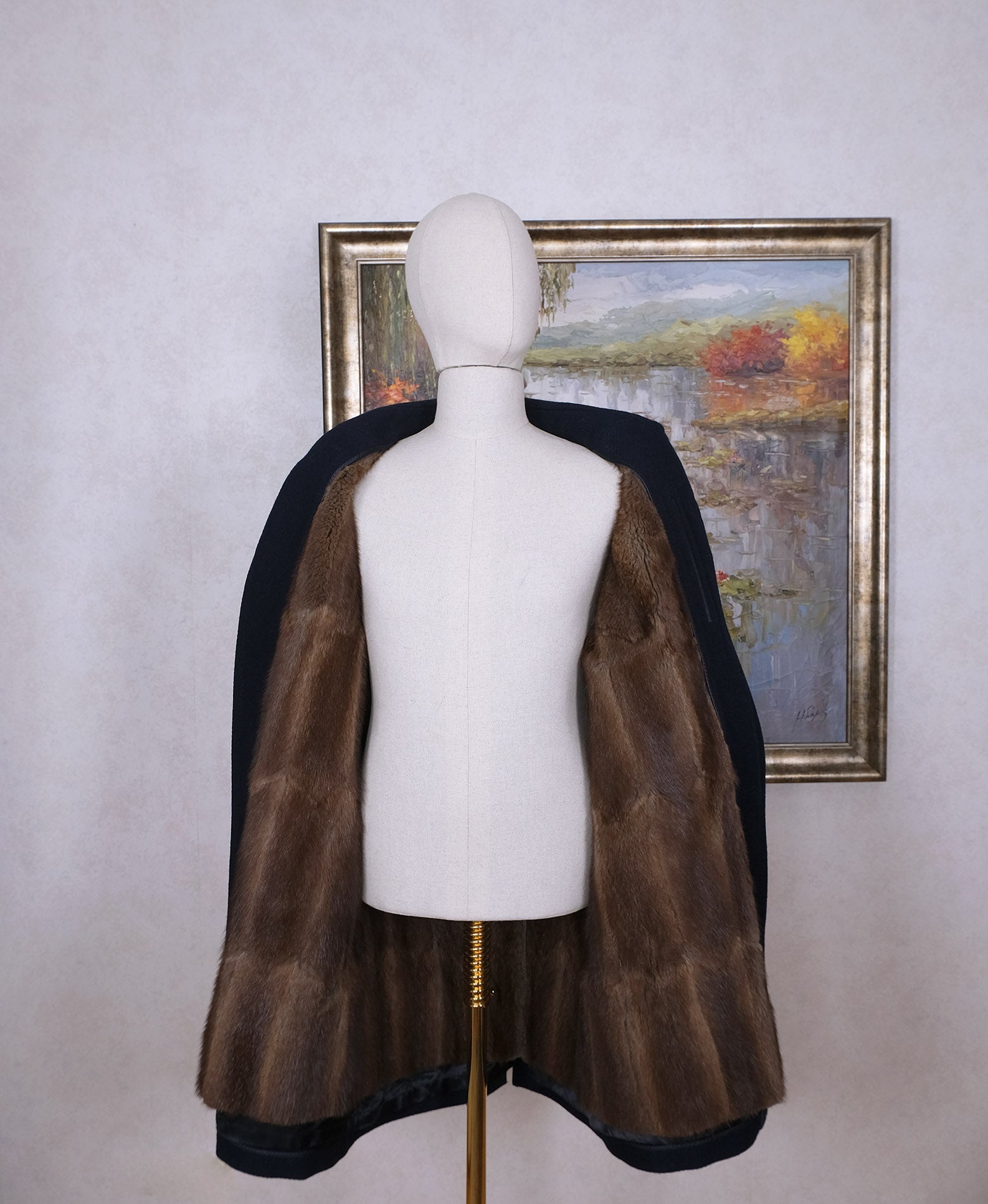 Tässä harvinainen palttoo: sen sisällä on hohtava, pehmein ja lämmin minkkivuori. Ennen vanhaan tällainen ratkaisu tunnettiin nimellä piiloturkki tai piiloturkis. Eipä tule kylmä Lapissakaan, jos tämä on yllä. Vuori on kiinni vetoketjulla, joten sen saa irti helposti.