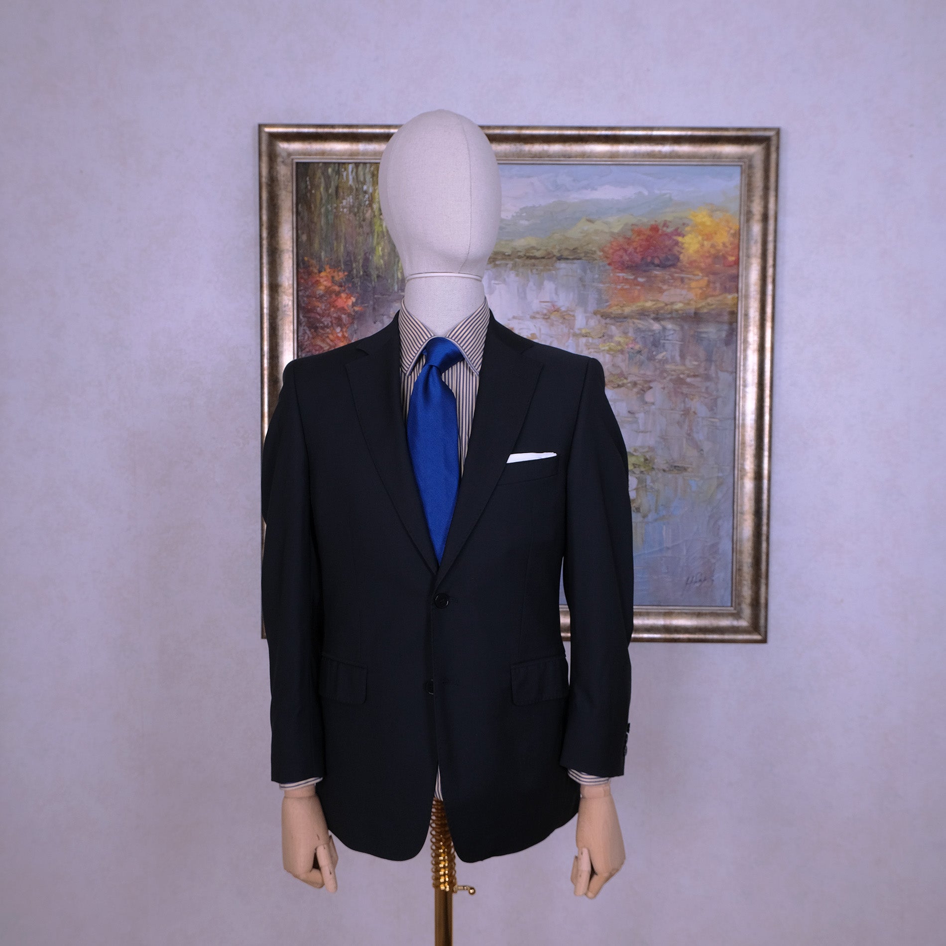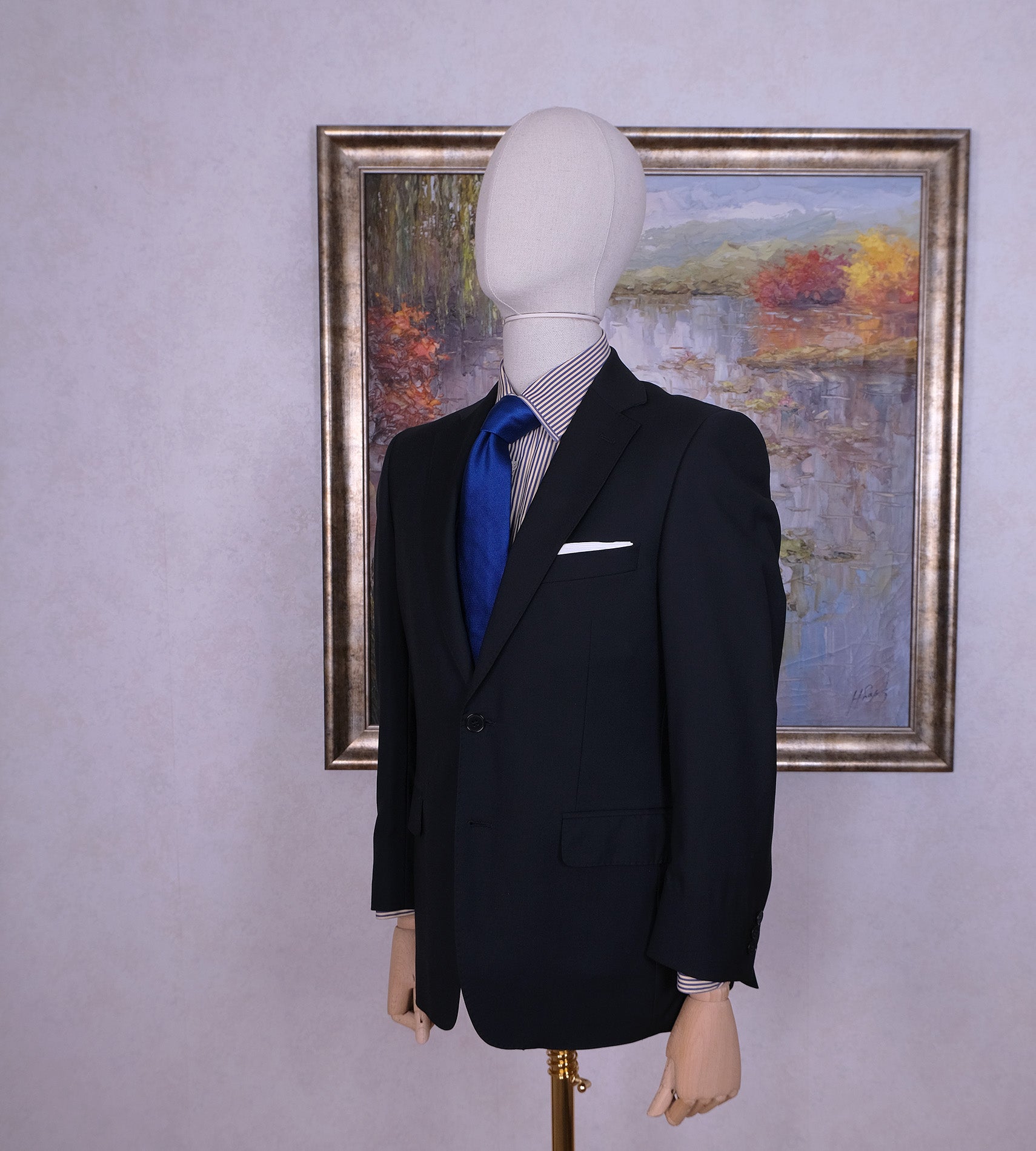 Tässä tumma puku kaikkeen edustamiseen. Kokomerkintä 48. Hihat sekä lahkeet on lyhennetty, mutta ompelija pidentää ne tarvittaessa helposti.