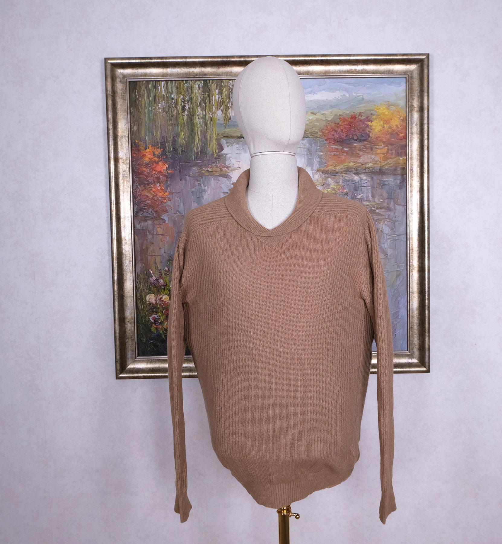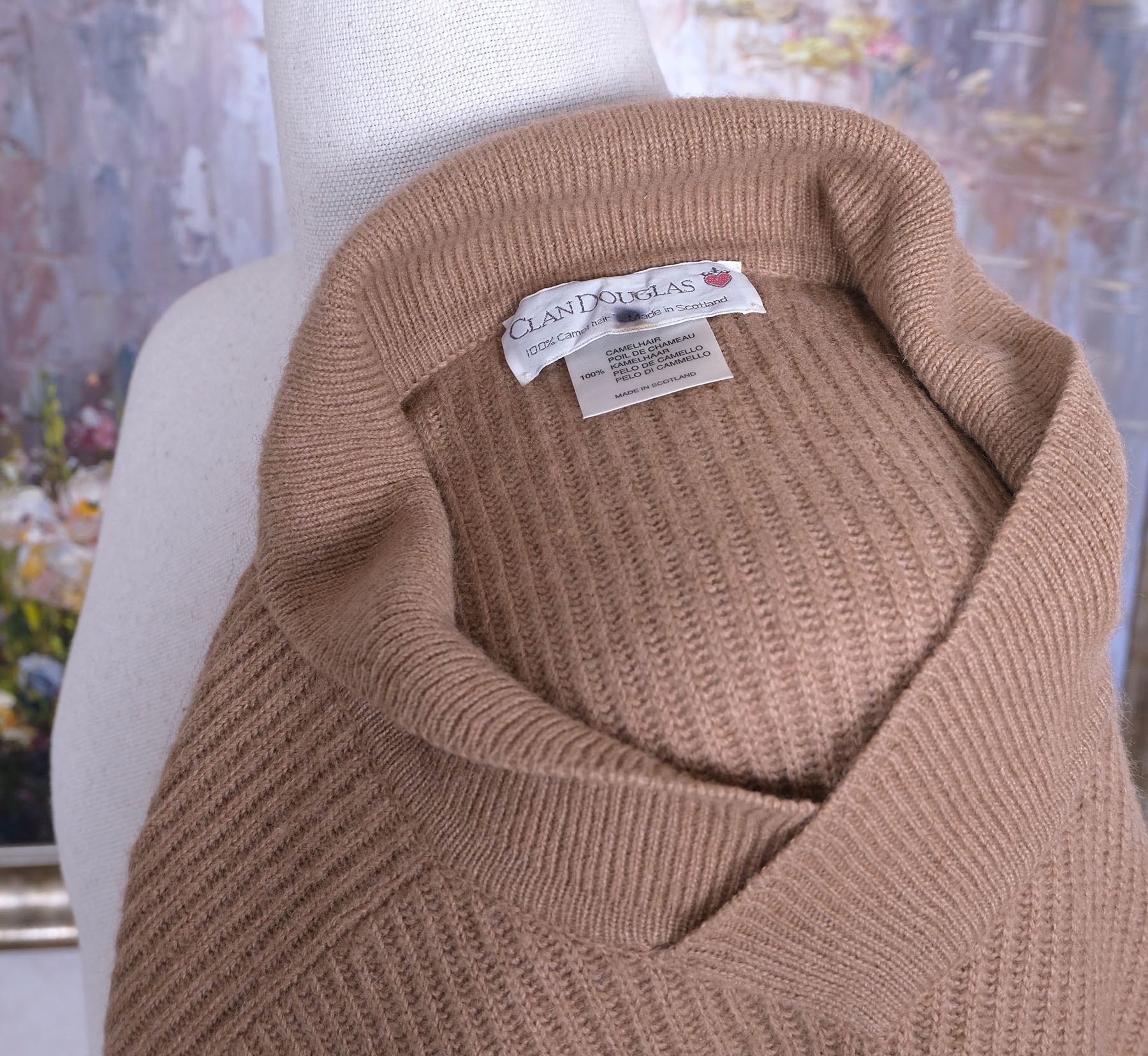 Clan Douglas, vaalea shaalikaulusneule, koko L, kamelinkarvaa