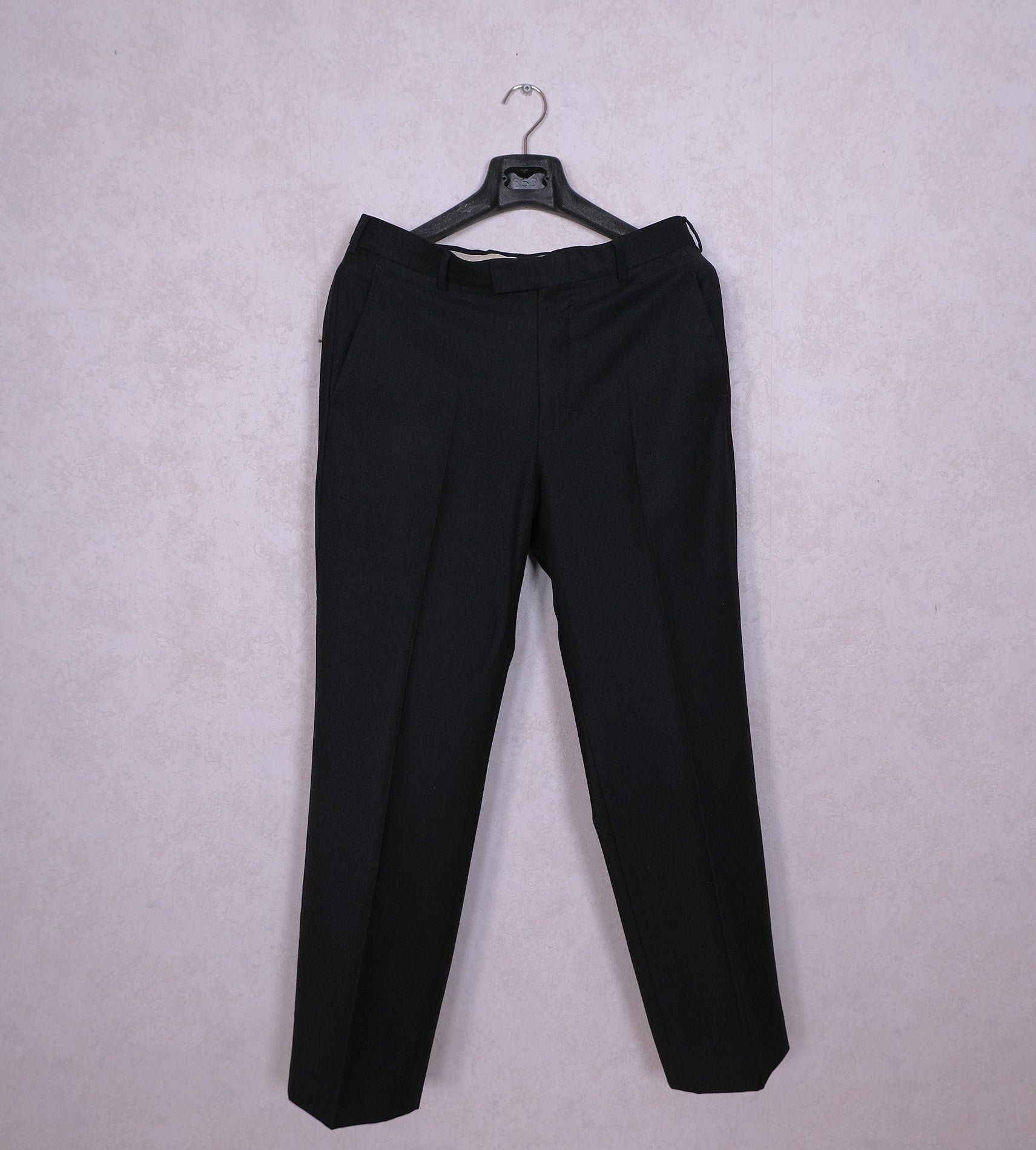 Tämä musta-harmaa puku on tehtaan nuorekkaammasta Z-mallistosta, joka on lopetettu. Kokomerkintä 48. Hihat ja lahkeet on lyhennetty, mutta ompelija pidentää ne tarvittaessa helposti.