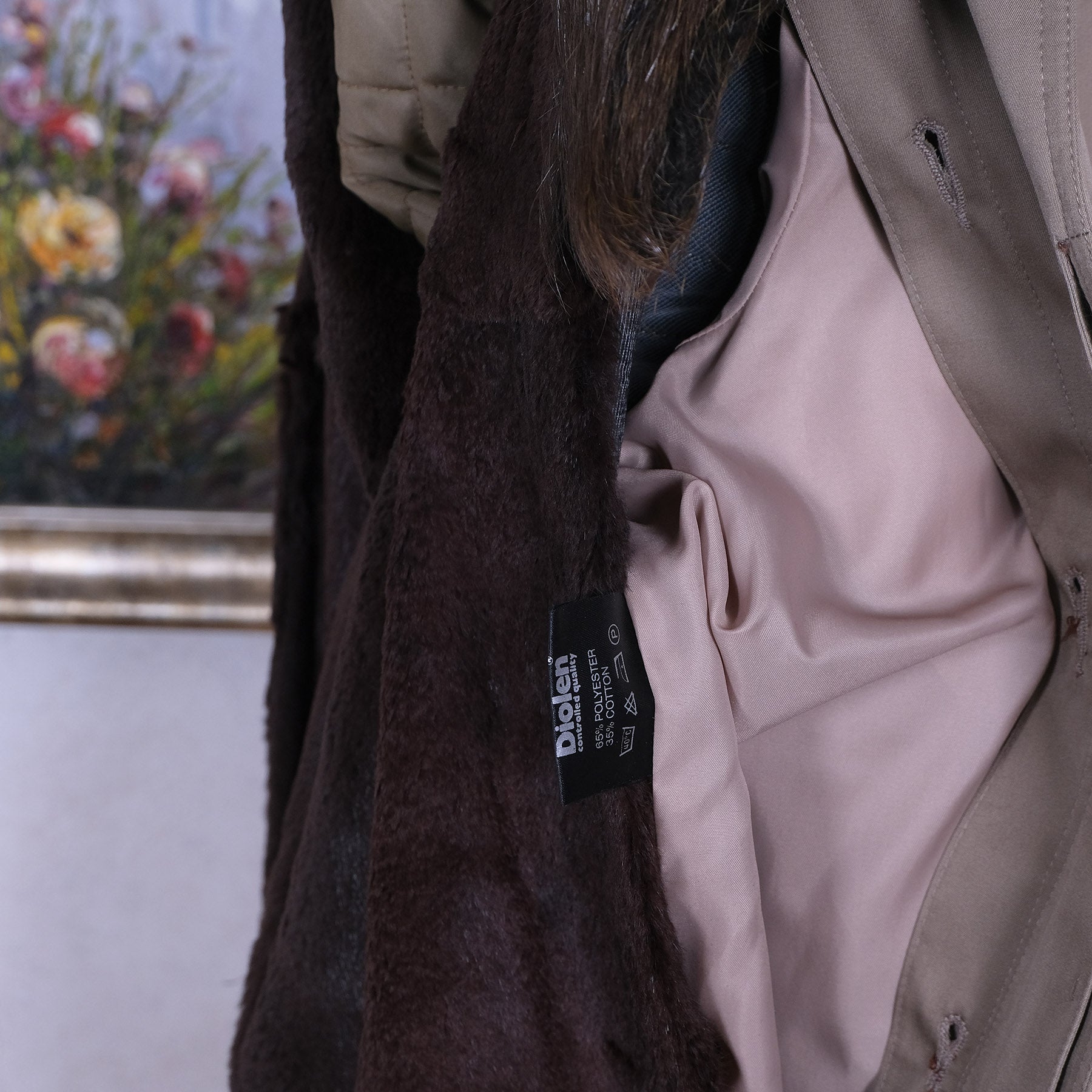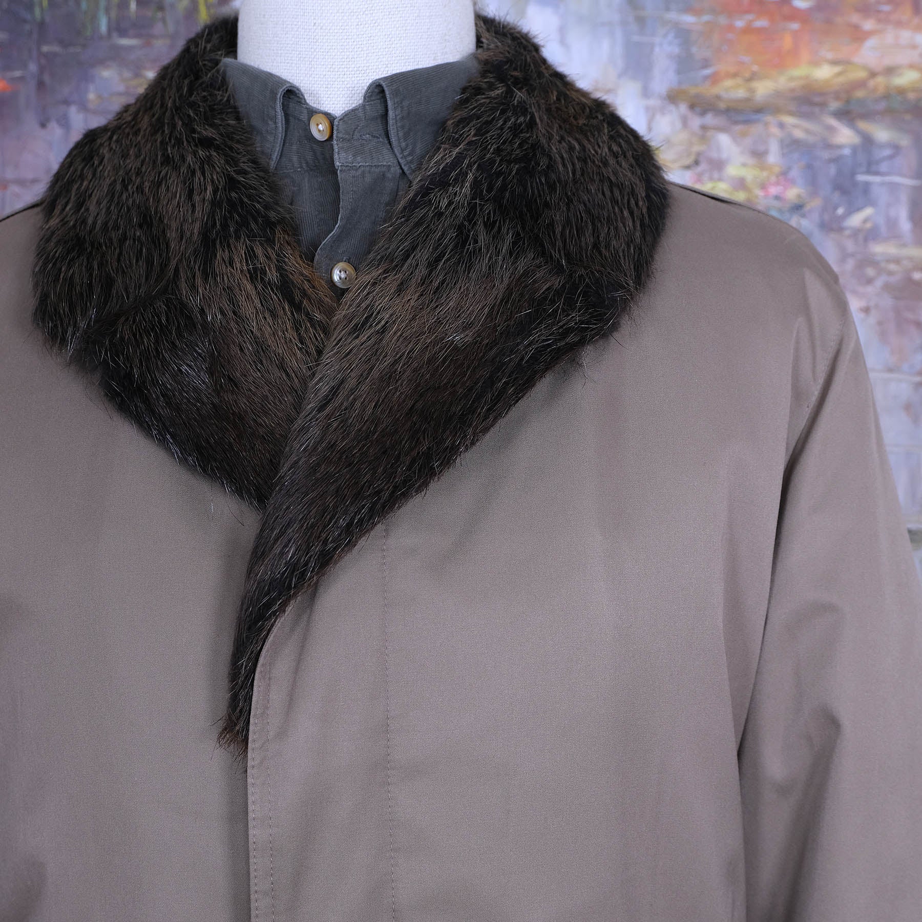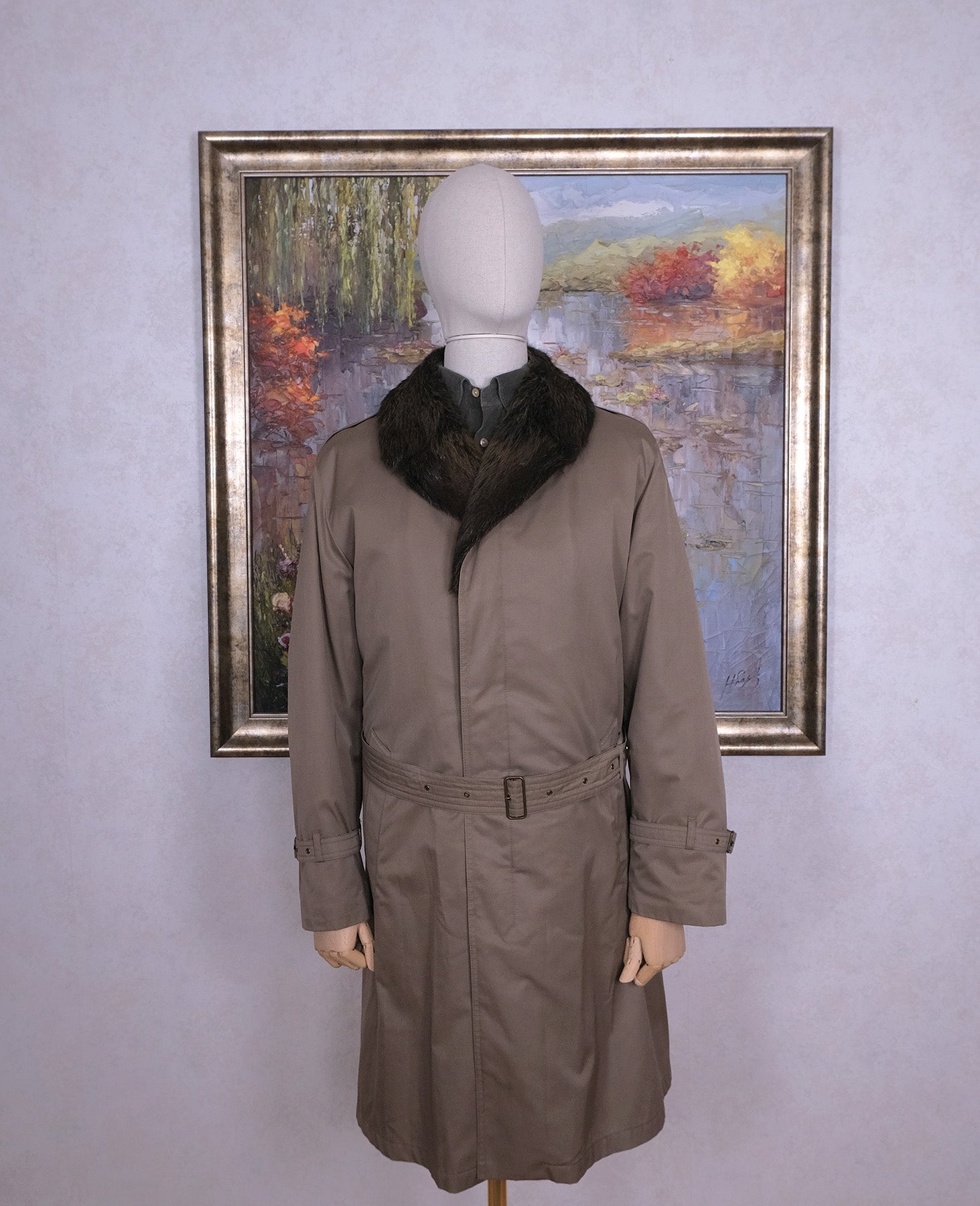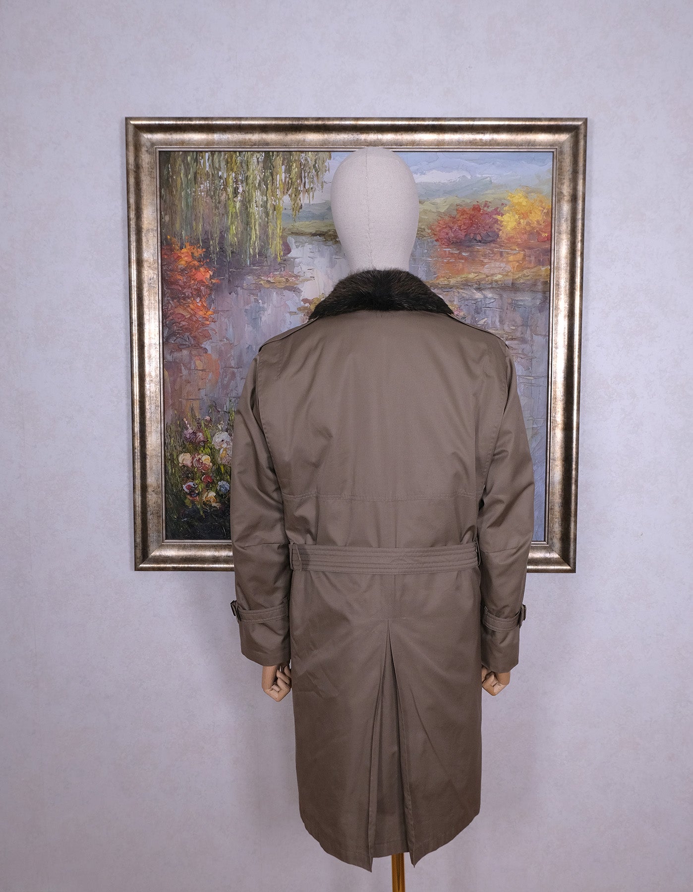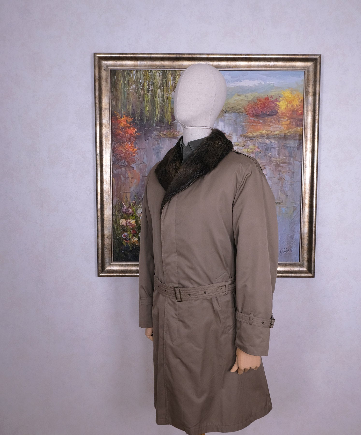 Tämä palttoo on päältä vaalea trenssi, mutta suurin juju on takin sisällä. Siellä on piilossa lämmin, pehmeä ja komea kaninturkkivuori. Se on kiinni napeilla, joten vuorin saa tarvittaessa kokonaan pois. Kaulan ympärillä on majavan turkis, jonka saa myös irti.
