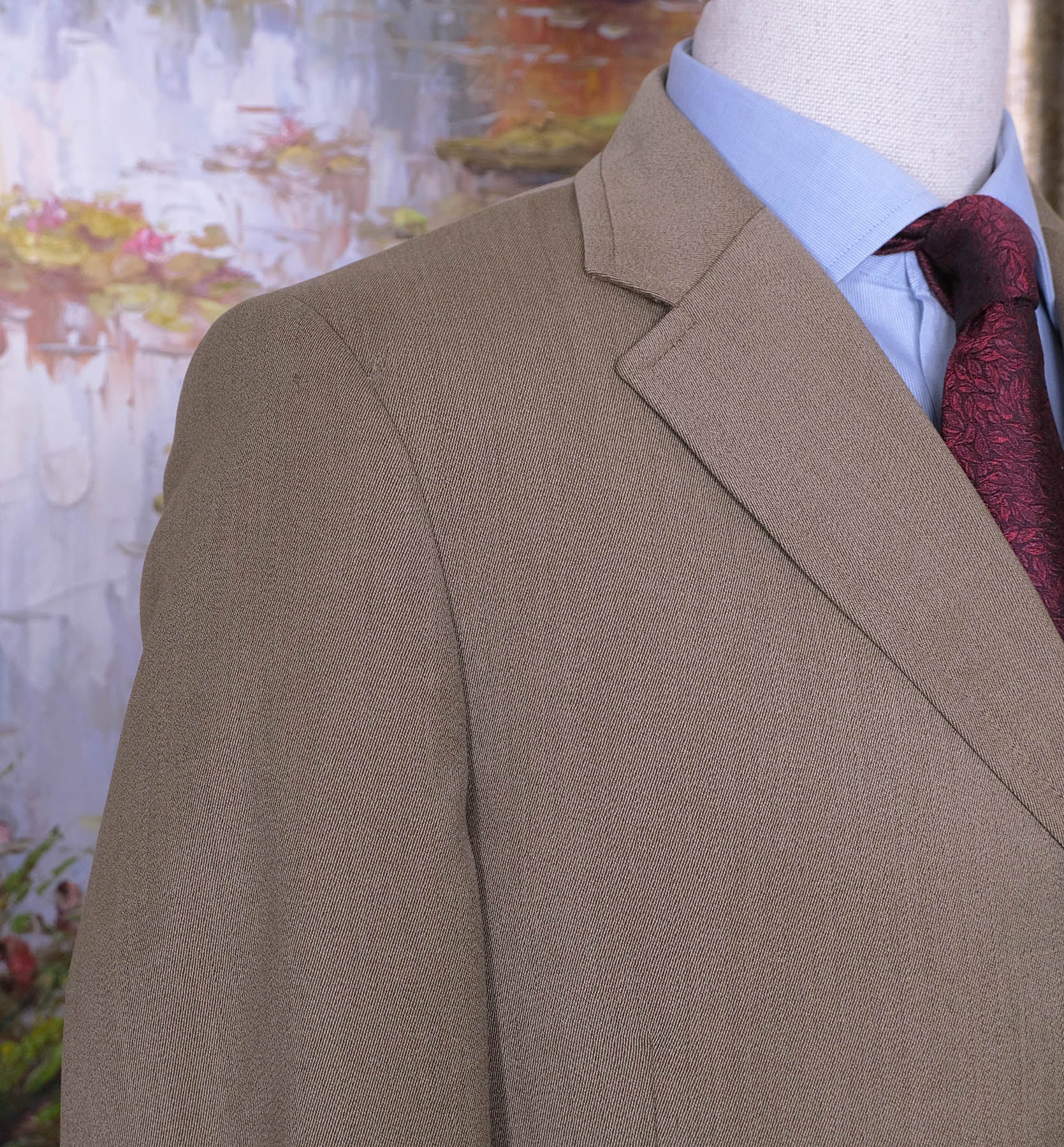 Kangas on 100 % hienoa, sileää, ohuempaa villaa. Vaalea covert-väritys.