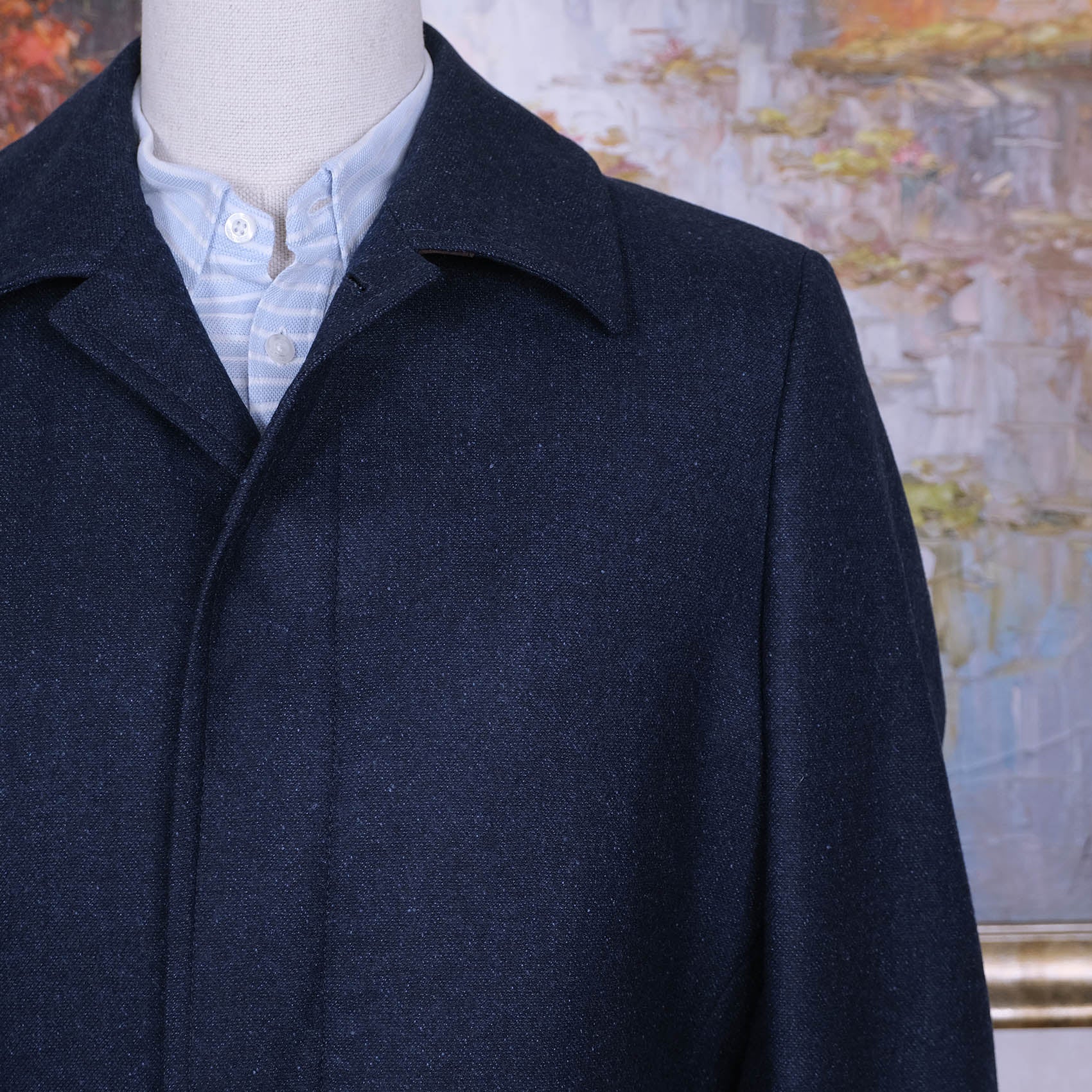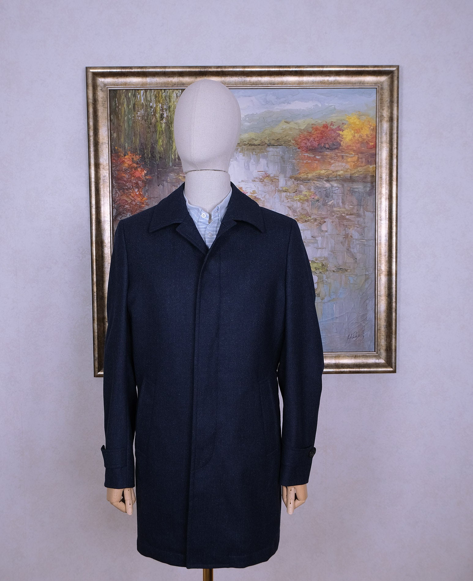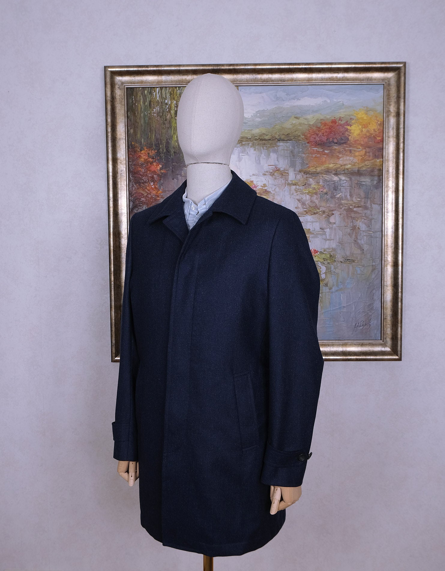 Tässä klassinen rain mac -tyylinen päällystakki, joka eroaa perusmallista. Tämä on puuvillan sijaan villakangasta ja sisällä on irrotettava tikkivuori. Näin takki sopii useampaan keliin. Malli on peräisin firman laadukkaimmasta J.P. Hackett -mallistosta.