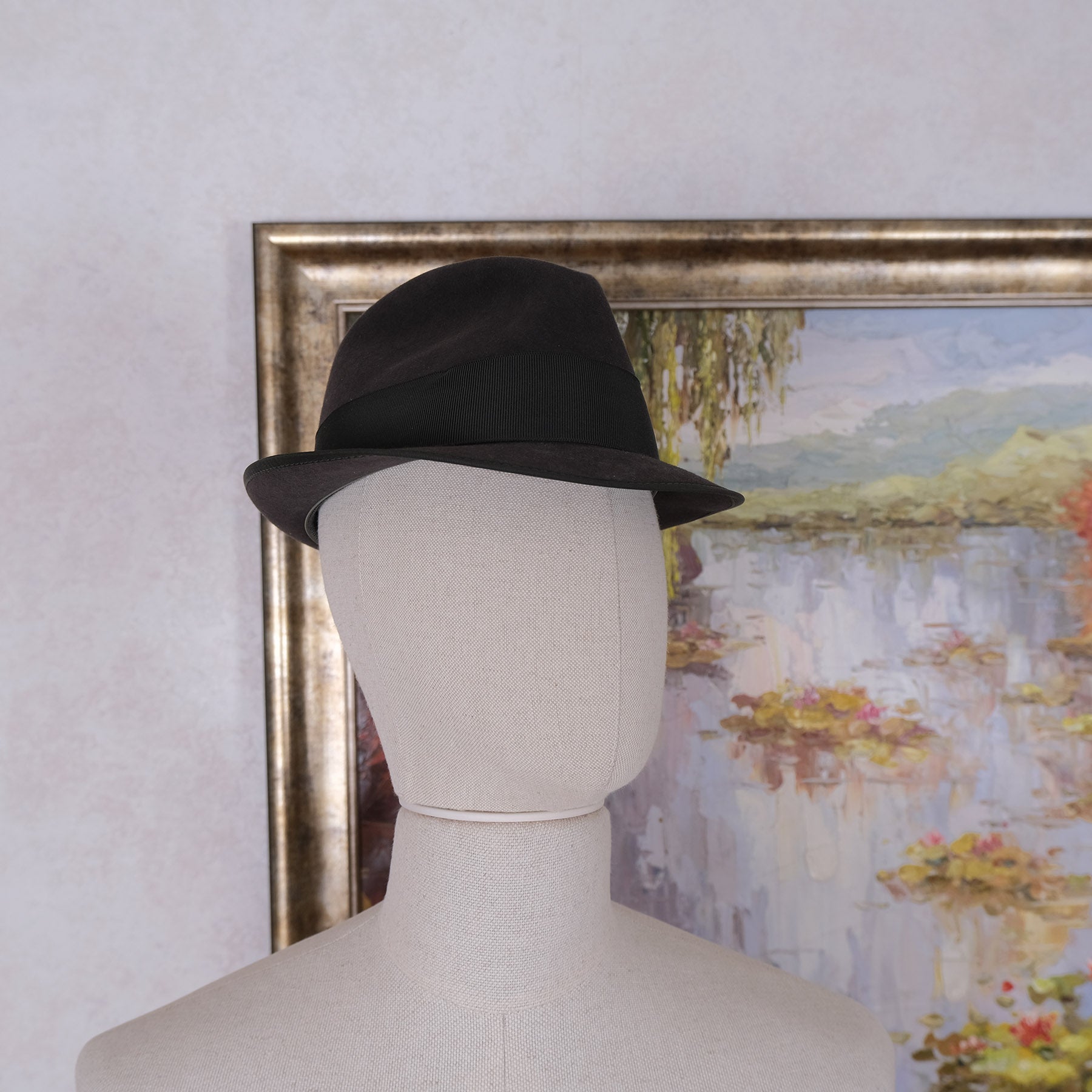 Tämä malli on trilby-tyyliä. Siinä ei ole kokomerkintää, mutta sisämittojen perusteella se istuu parhaiten 60-kokoiseen päähän.