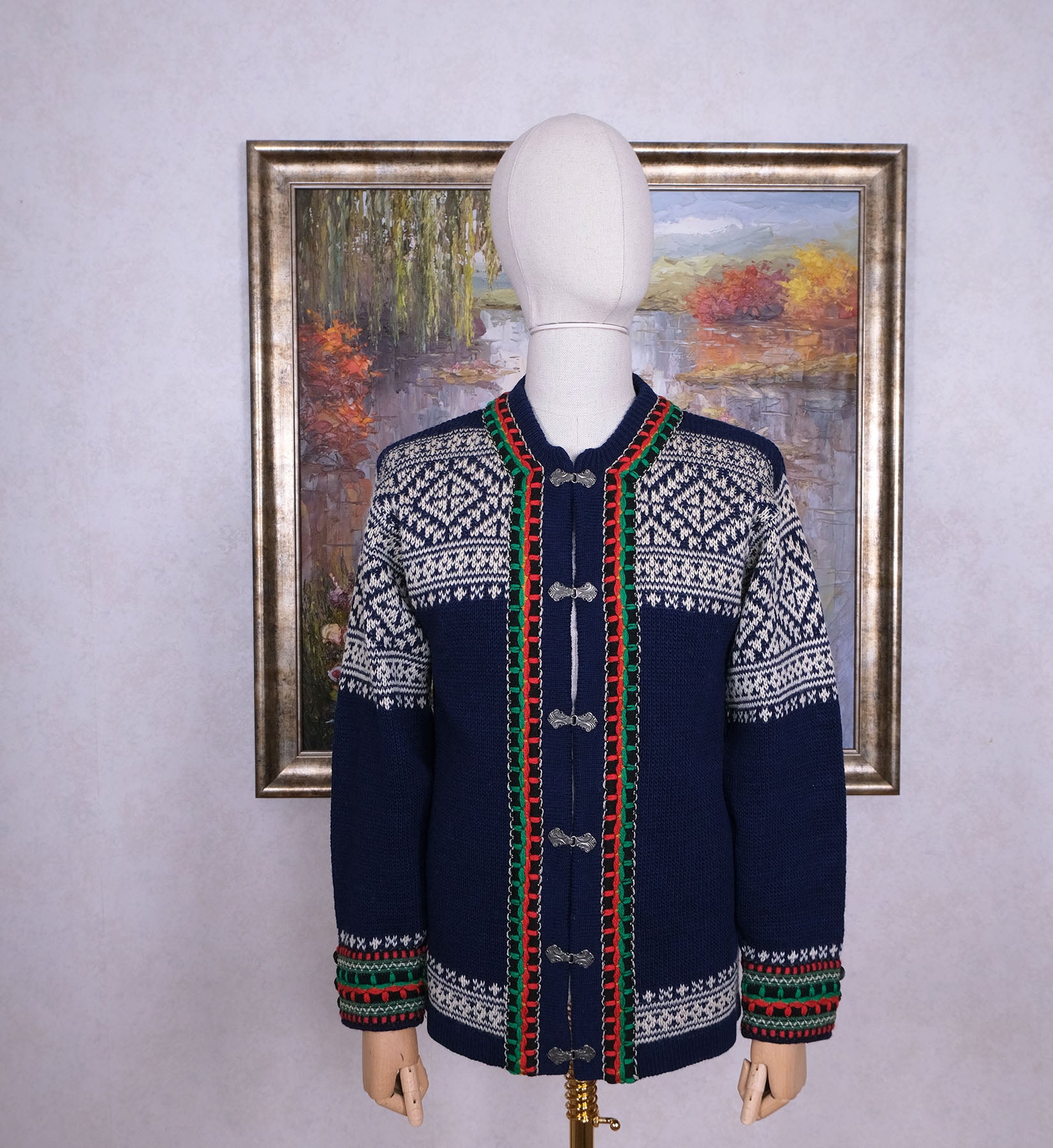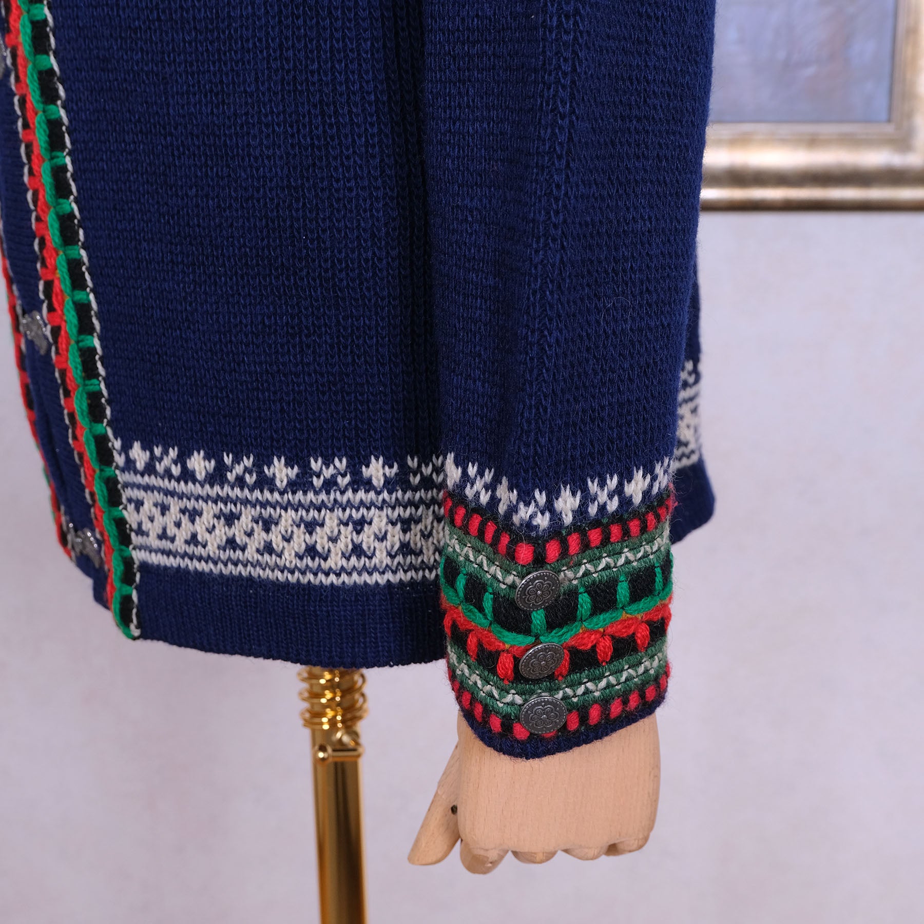 Neuleessa on hakakiinnitys, norjalaiskuviointi ja metallinapit hihansuissa. Napit saa tarvittaessa helposti irti.