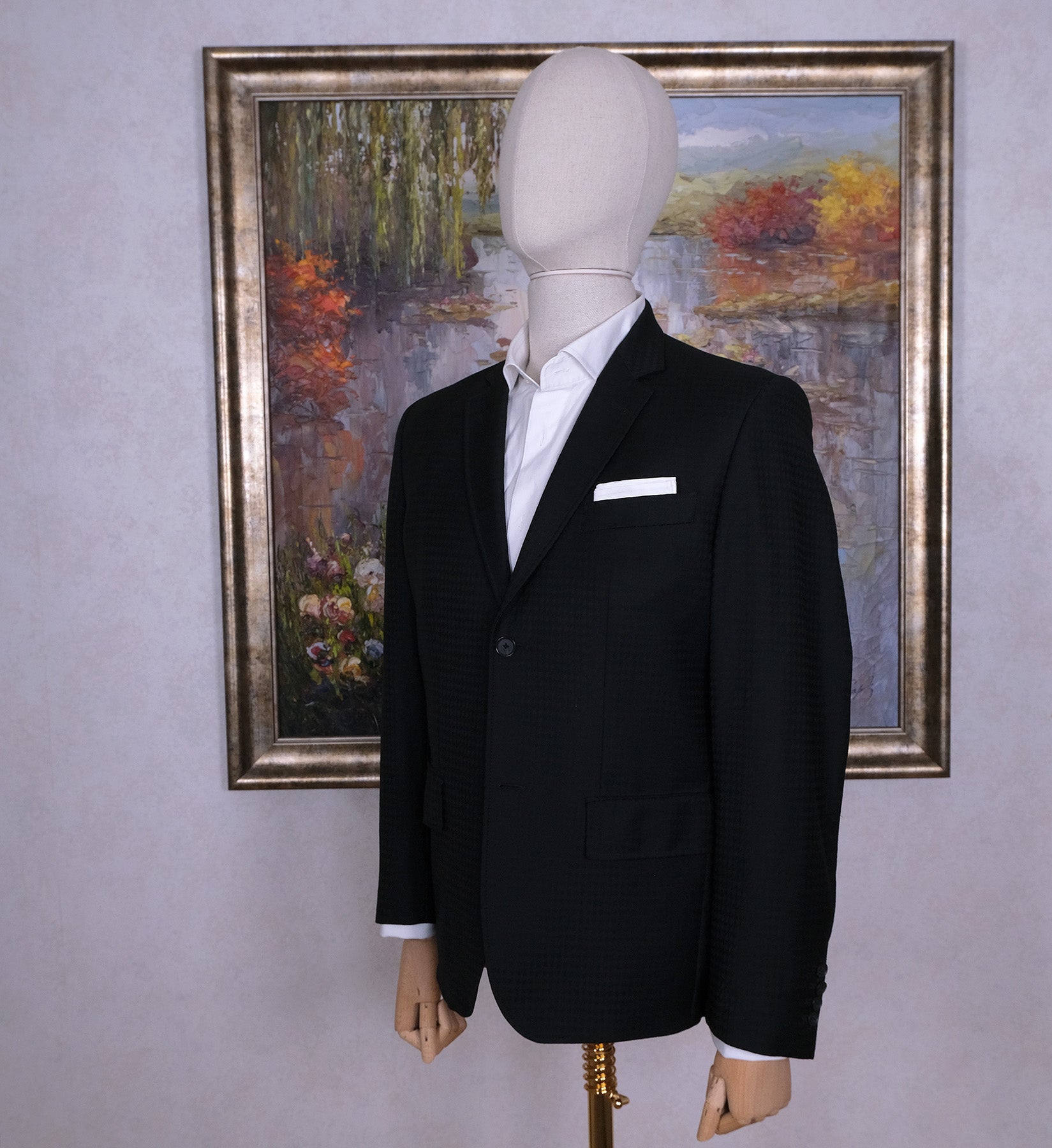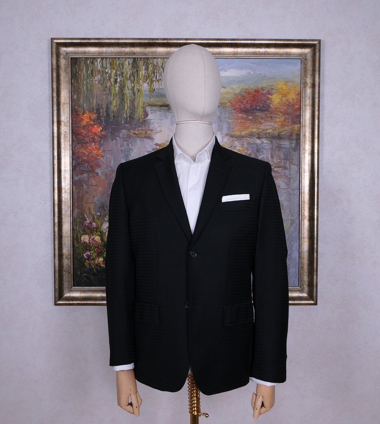 Valmistettu vastuullisesti Euroopassa. Takissa on näyttävä kukonaskelkuvioinen kangas, joten tästä voi saada myös hienon hääasun.