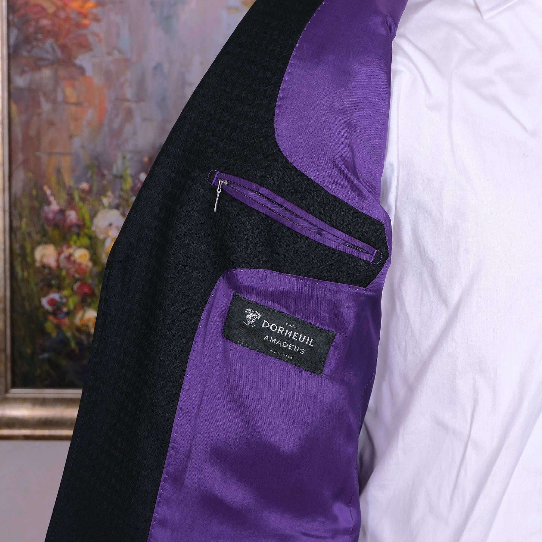 Kangas on 100 % neitsytvillaa ja oikein pehmeä, sileä ja keskipaksu juhlakangas. Näyttävä materiaali heijastaa valoa elävästi. Kankaan on valmistanut Englannissa maineikas Dormeuilin kutomo.