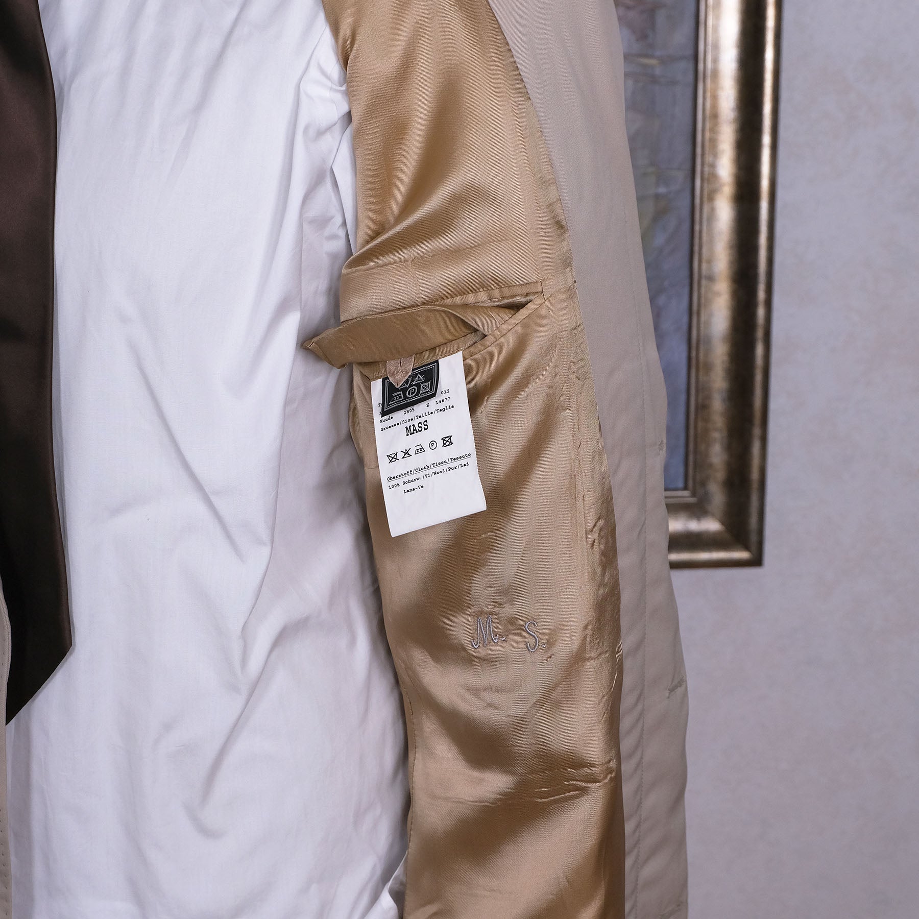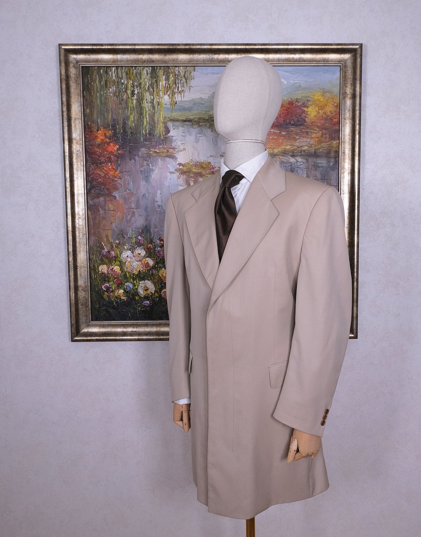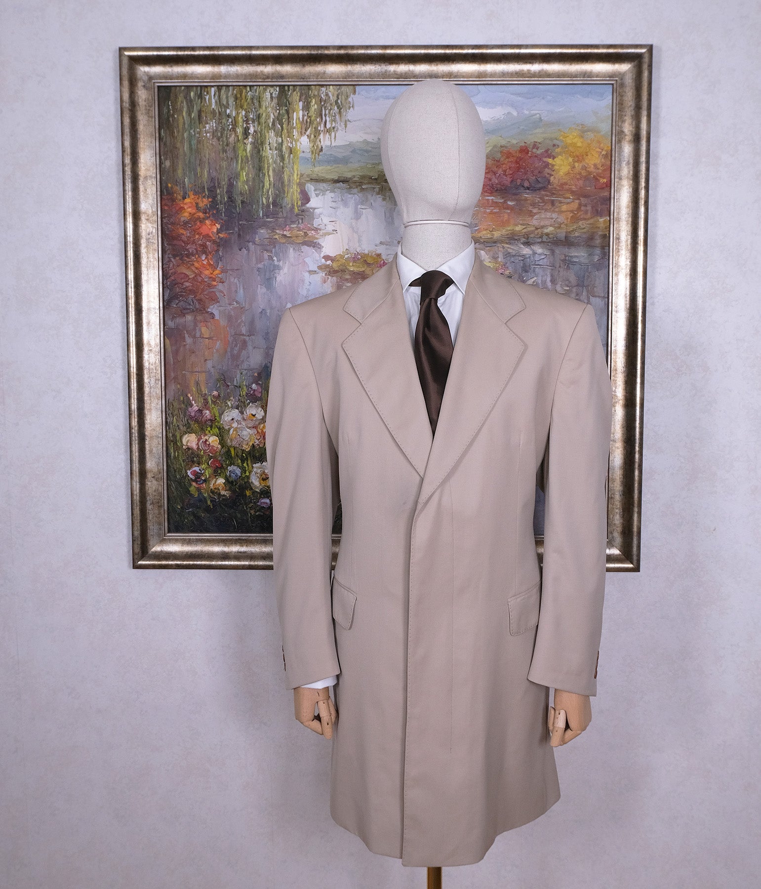 Tämä hiekanvärinen kevyt palttoo on valmistettu mittatilauksena alkuperäisen tilaajan mitoilla - katso ne alta. Istuu parhaiten 54-kokoiselle miehelle.