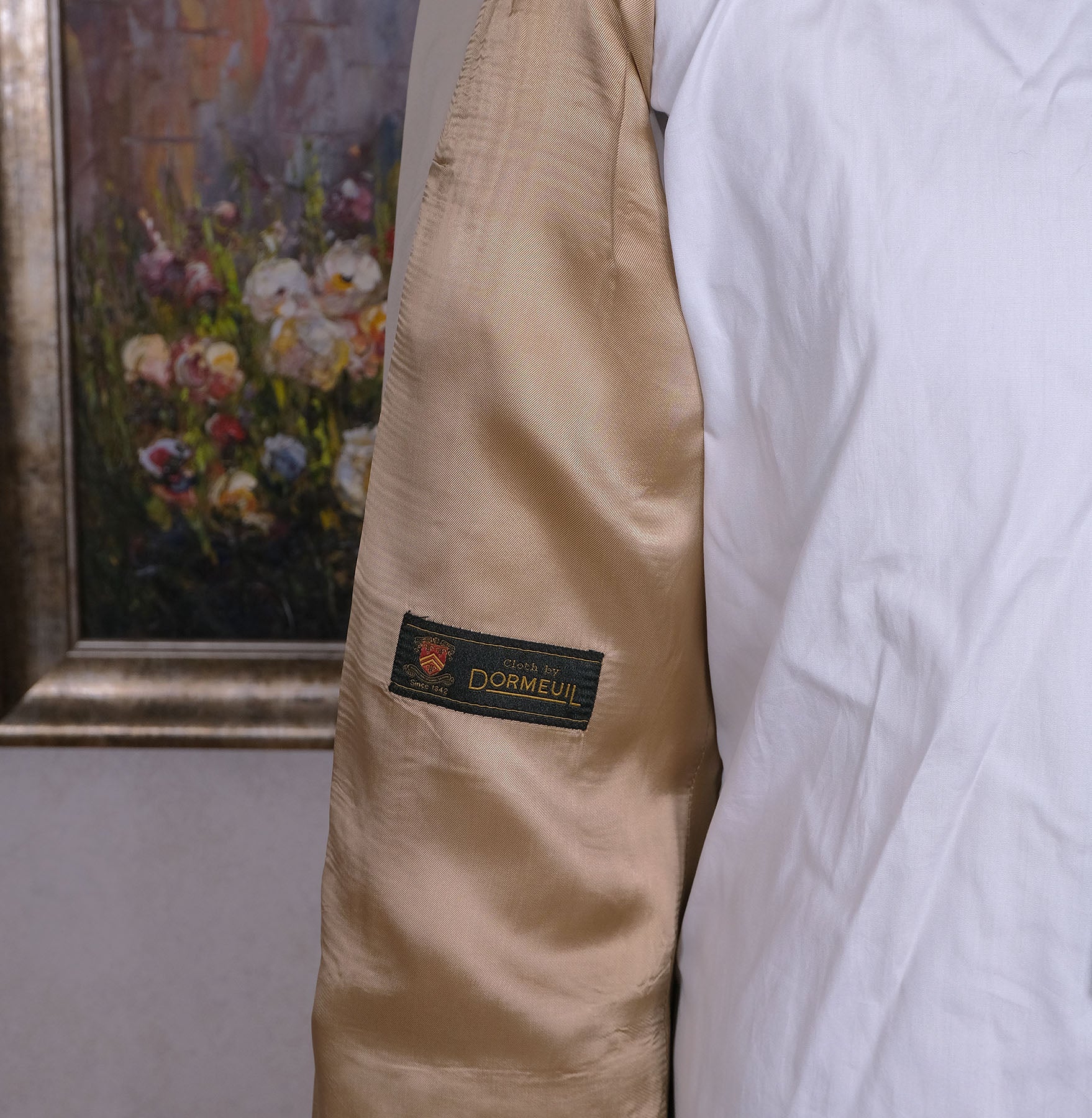 Kangas on 100 % sileää ja keskipaksua neitsytvillaa. Oikein pehmeä ja miellyttävä materiaali. Kankaan on valmistanut Englannissa maineikas Dormeuilin kutomo.
