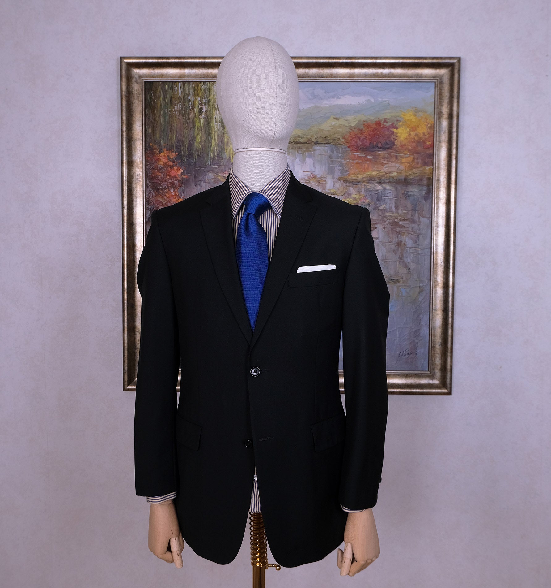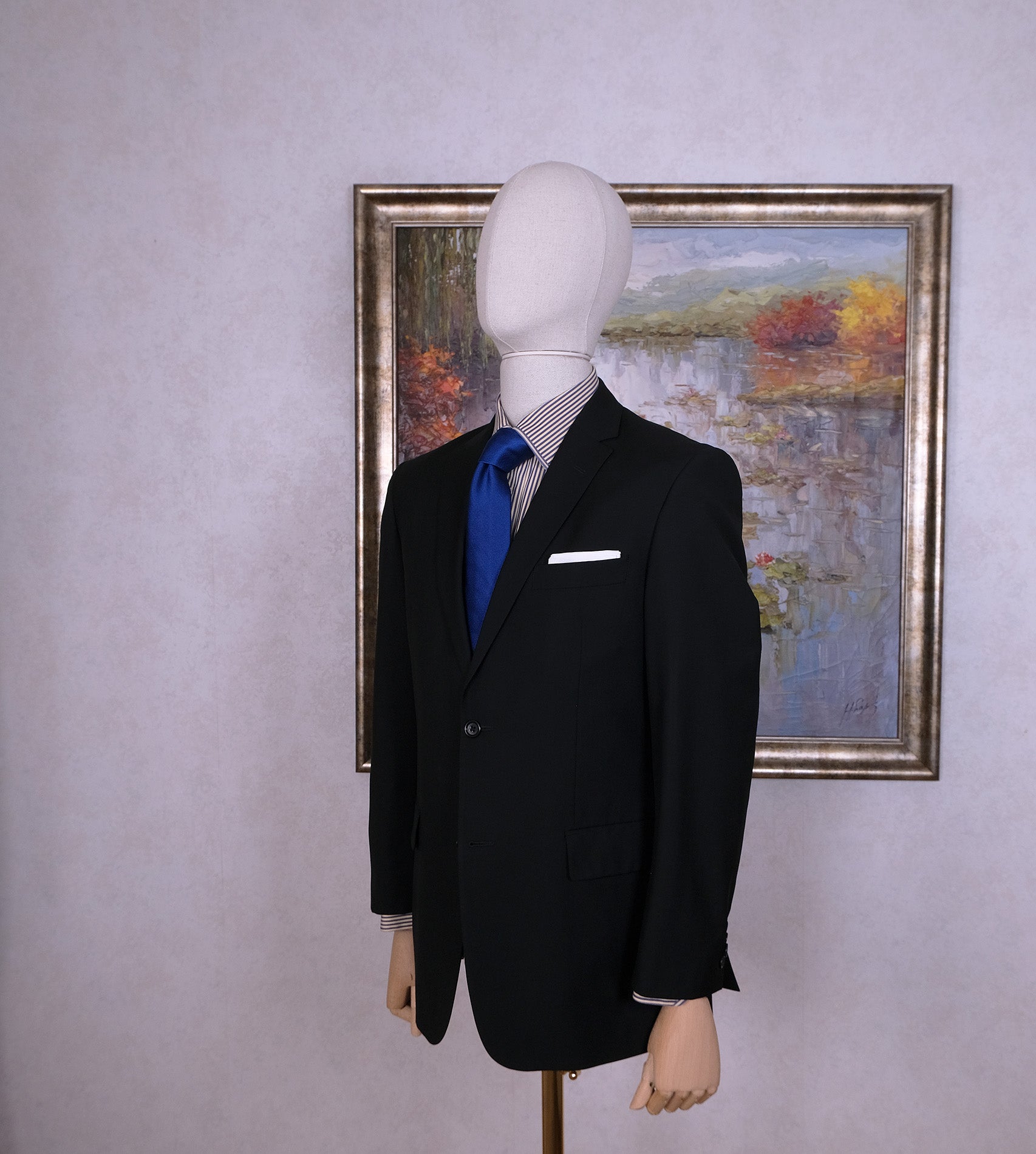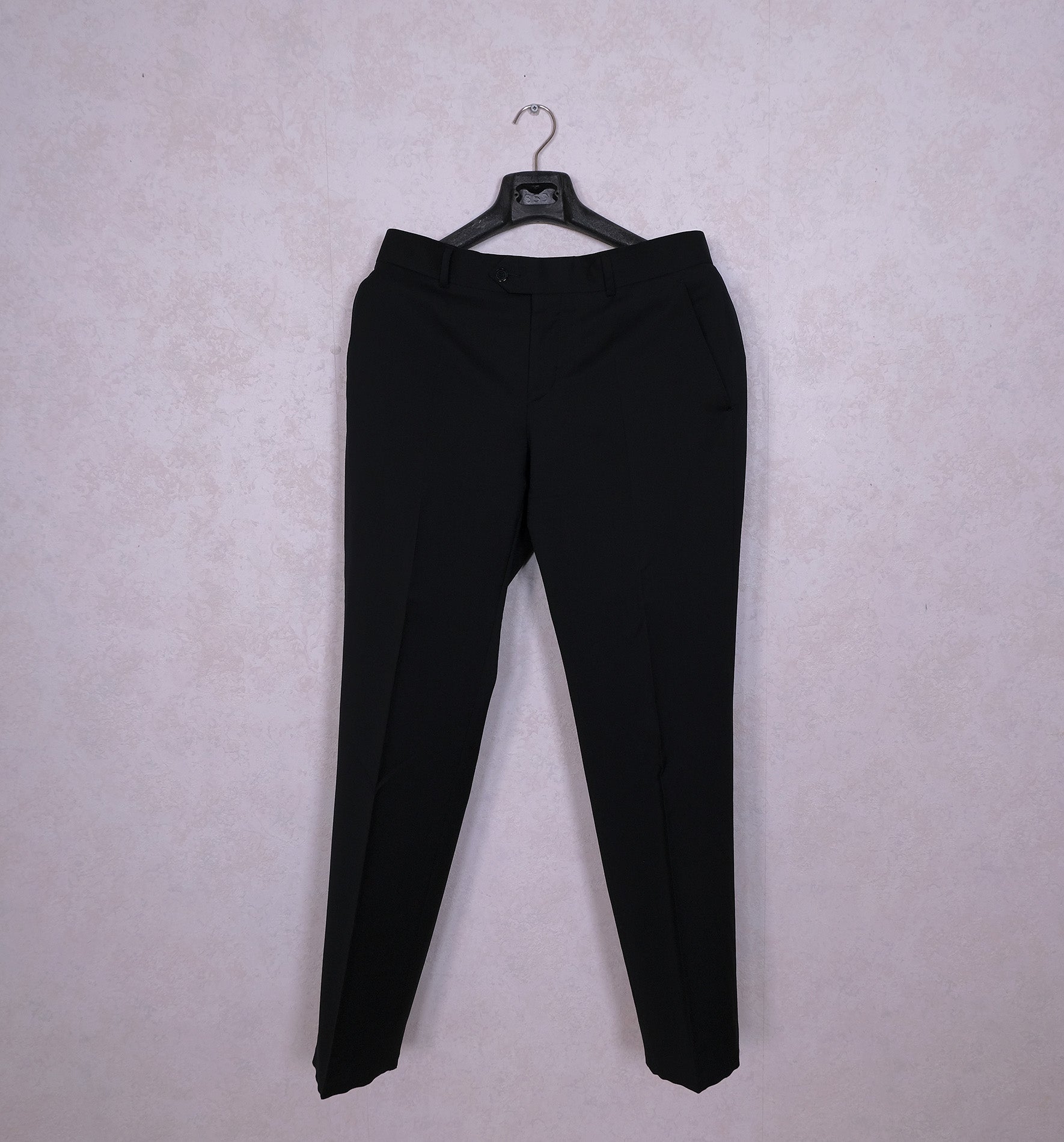 Tässä musta puku kaikkeen edustamiseen. Kokomerkintä 48. Hihat sekä lahkeet on lyhennetty, mutta ompelija pidentää ne tarvittaessa helposti.